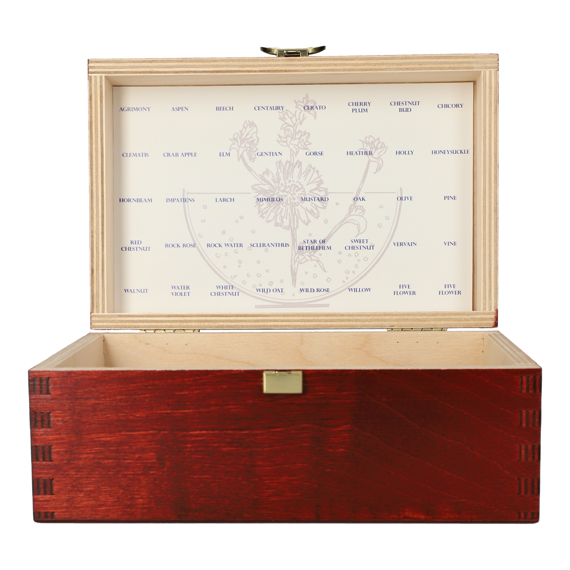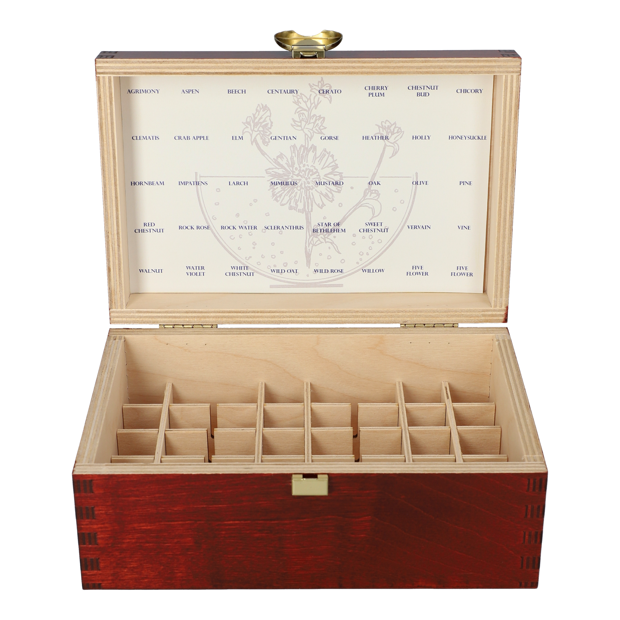Sie können ein ganzes Bachblütenset darin aufbewahren oder einzelne Essenzen. Der Holzkasten ist auch individuell modulierbar durch die Holzeinsätze.