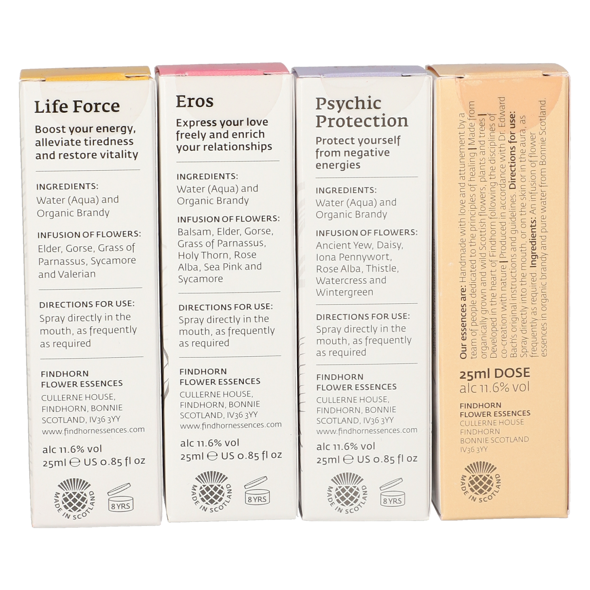 Die Findhorn Blütenessenzen werden zu besonderen Zeiten des Jahres hergestellt, den so genannten keltischen "Festen", wenn die spirituellen Energien und die Lebenskraft der Natur besonders stark sind. Sacred Energy kann jederzeit verwendet werden, um ein Gefühl der Sicherheit und des Schutzes zu fördern, und ist besonders nützlich zu Hause am Abend, um ein Gefühl der Ruhe vor dem Schlaf und beim Aufwachen, um einen geschützten Tag zu fördern. Sacred Energy wurde für Zeiten geschaffen, in denen wir ein energetisches Schutzschild errichten möchten, um einen tieferen emotionalen und spirituellen Schutz zu erhalten. Anwendung: Äußere Anwendung: Schütteln Sie die Flasche vor dem Gebrauch. Sprayen Sie im Raum oder in die Aura, so oft Sie möchten und bis eine Verbesserung der Situation eintritt. Essenzen können auch äußerlich angewandt werden, indem man sie Lotionen oder Salben beimischt oder sie ins Badewasser gibt, was besonders effektiv ist. Zusammensetzung: Energieschild-Kombinationsessenz (Diamant-, Erd-, Wasser-, Feuer-, Luft- und Ätheressenz); ätherische Öle von Pfefferminze und Lavendel; gereinigtes Wasser, Brandy. Hinweise: Alkoholgehalt: 12 % Vol. Kühl lagern. Außerhalb der Reichweite von Kindern aufbewahren. Rechtlicher Hinweis: Essenzen und Schwingungsmittel sind im Sinne des Art. 2 der VO (EG) Nr. 178/2002 Lebensmittel und haben keine direkte, nach klassisch wissenschaftlichen Maßstäben nachgewiesene Wirkung auf Körper oder Psyche. Alle Aussagen beziehen sich ausschließlich auf energetische Aspekte wie Aura, Meridiane, Chakren etc.