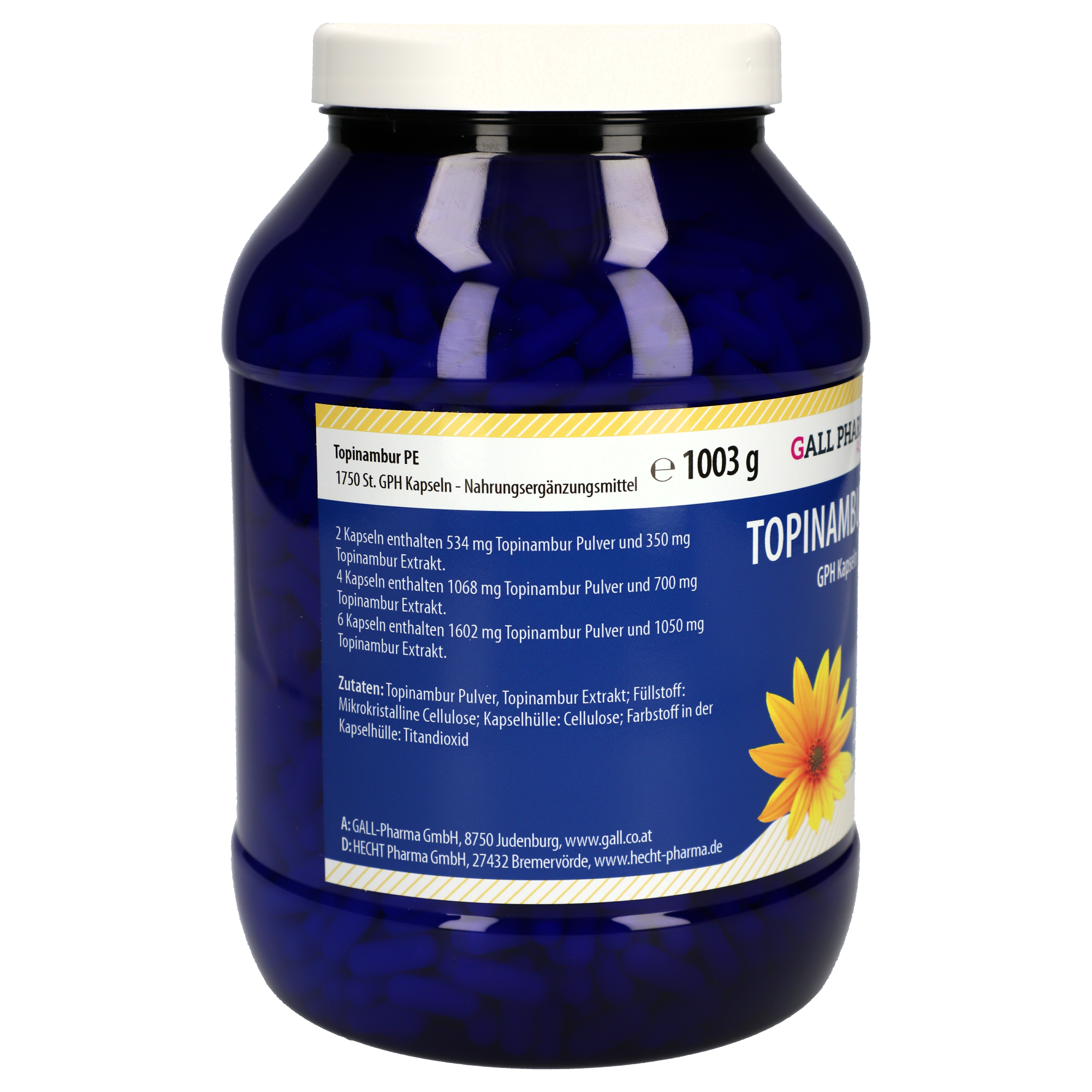 2 Kapseln enthalten 534 mg Topinambur Pulver und 350 mg Topinambur Extrakt.
