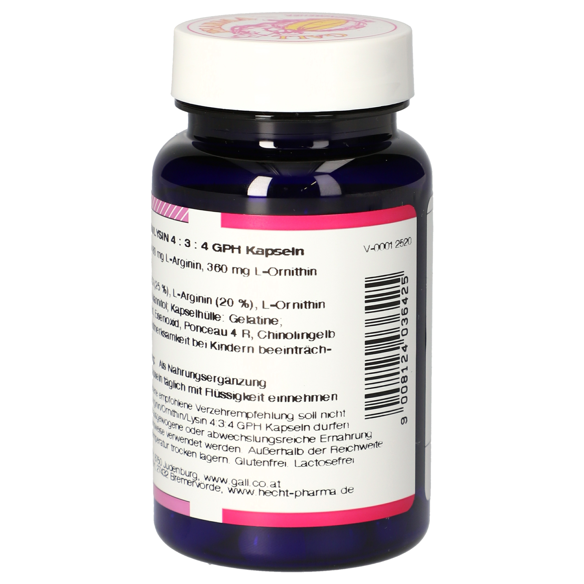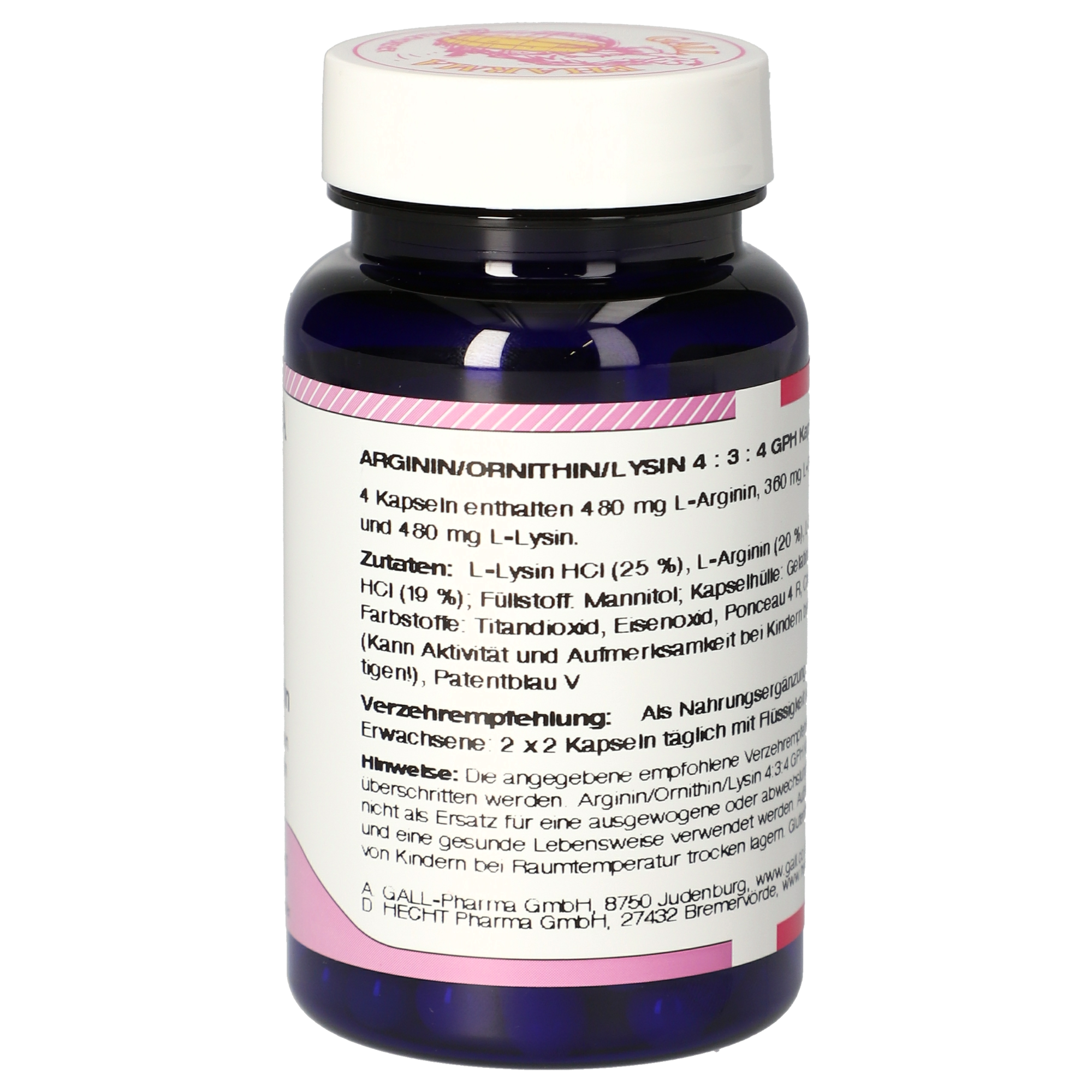 4 Kapseln enthalten 480 mg L-Arginin, 360 mg L-Ornithin und 480 mg L-Lysin.