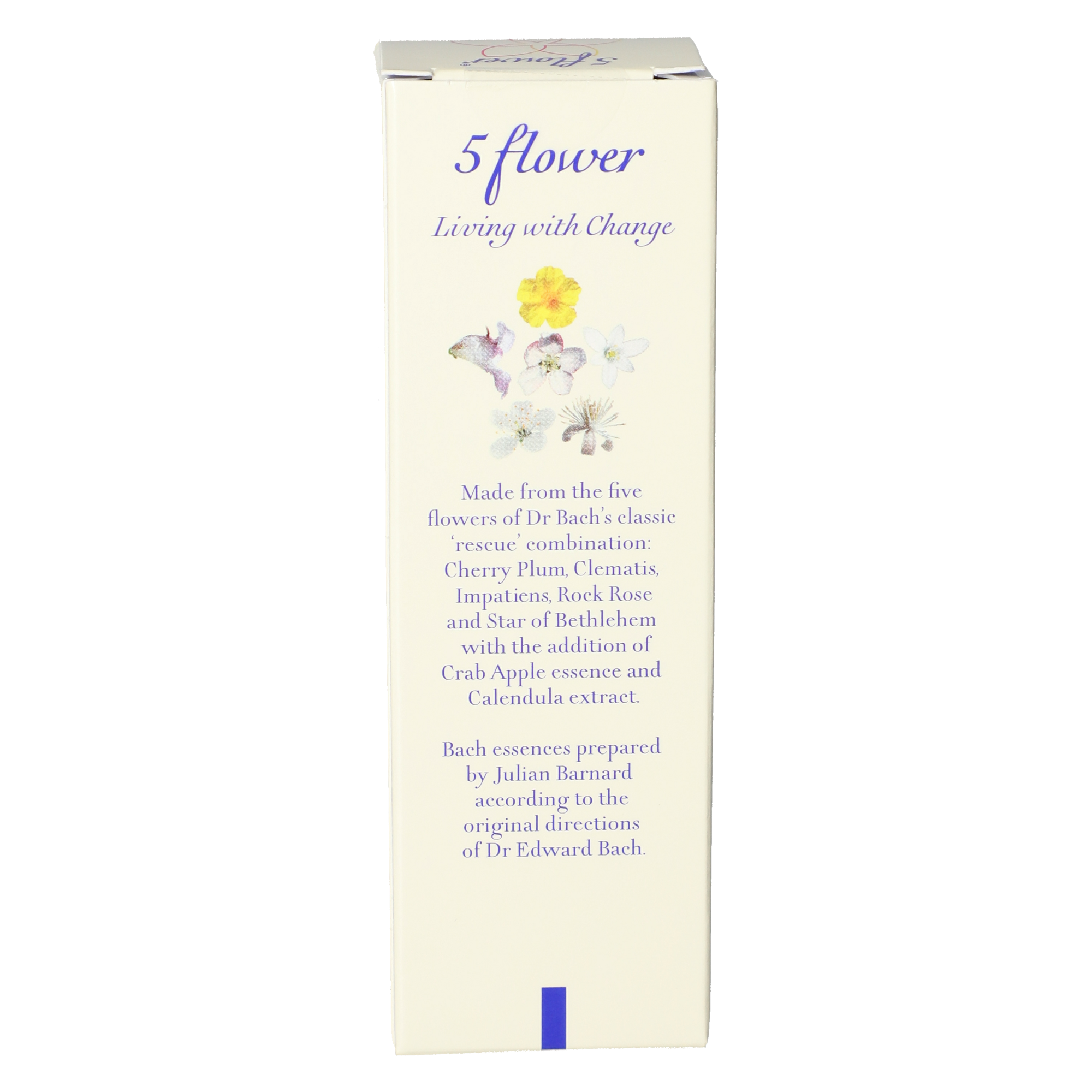Enthält die Blütenmischung aus Star of Bethlehem, Rock Rose, Impatiens, Cherry Plum, Clematis, Crab Apple und Calendula.