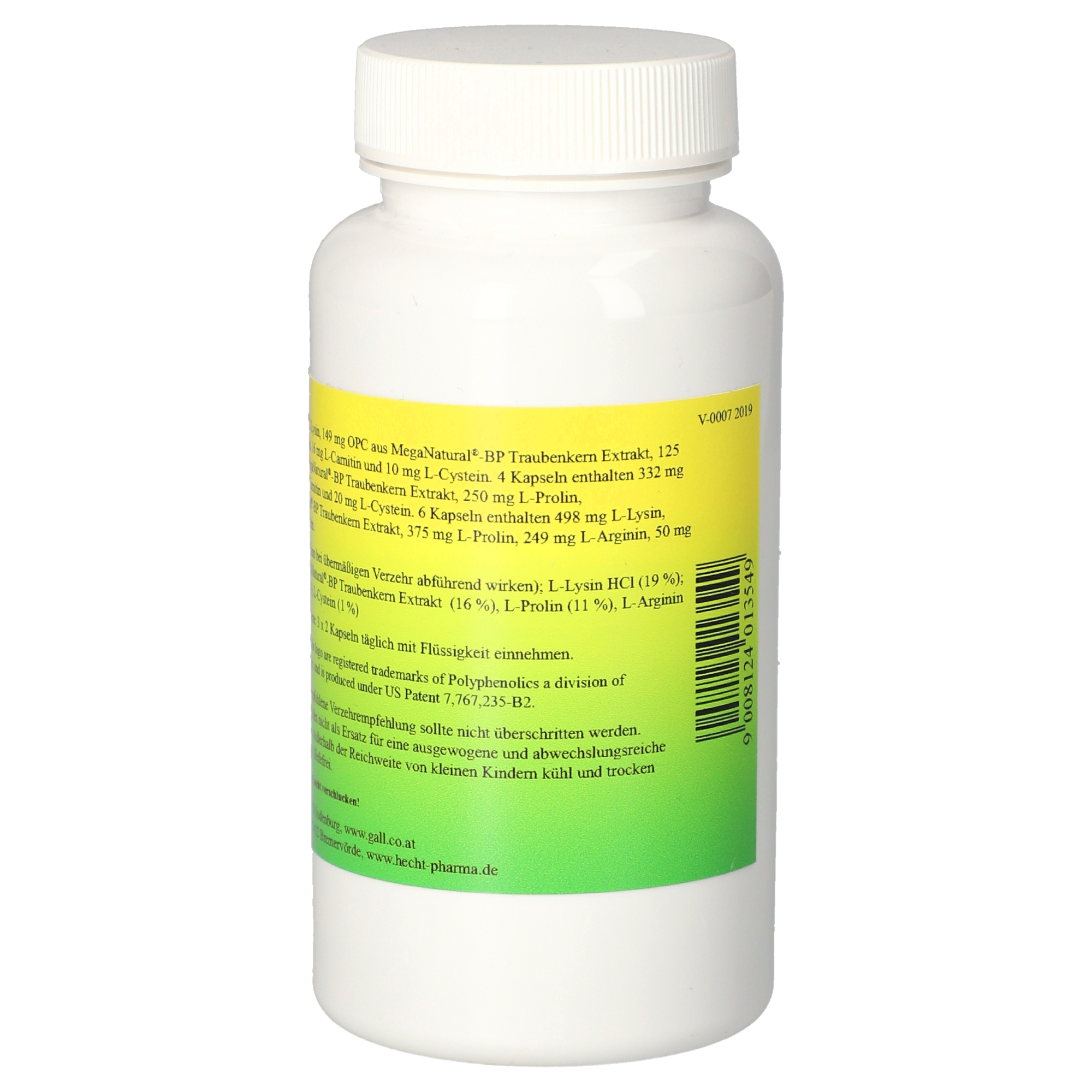 6 Kapseln enthalten 500 mg L-Lysin, 447 mg OPC aus Mega Natural® BP Traubenkern Extrakt, 375 mg L-Prolin, 250 mg L-Arginin, 50 mg L-Carnitin und 30 mg L-Cystein.