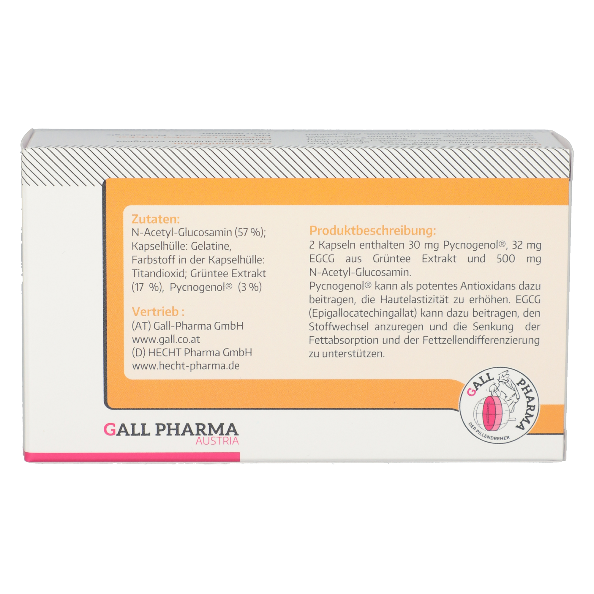 2 Kapseln enthalten 30 mg Kiefernrinden Extrakt (Pycnogenol®), 32 mg EGCG aus Grüntee Extrakt und 500 mg N-Acetyl-Glucosamin (Hyalurogluco™).