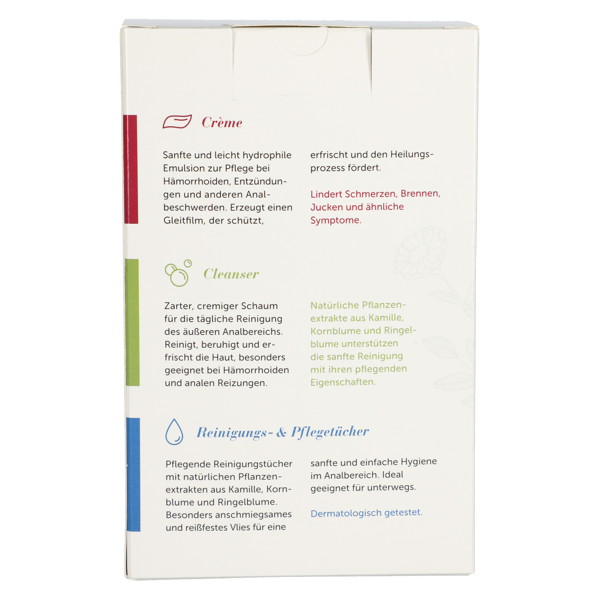 Das Anulind® Starter Set enthält die Anulind® Creme, den Anulind® Waschschaum und die Anulind® Reinigungs-& Pflegetücher. Die Anulind® Creme ist eine schützende Emulsion zur Linderung der Symptome bei Hämorrhoiden und Analbeschwerden. Hilft bei Schmerzen, Juckreiz und Brennen. Erzeugt einen Gleitfilm, der schützt und erfrischt. Der zarte, cremige Schaum ist die ideale Reinigung für den empfindlichen äußeren Analbereich und besonders auf die Anwendung bei schmerzenden Hämorrhoiden abgestimmt. Die milden Tücher sind ideal für die sanfte Reinigung zwischendurch und unterwegs geeignet, um die empfindliche Haut im Afterbereich zu pflegen und auf die Anwendung der Anulind® Creme vorzubereiten. Anwendung:Anulind® Creme morgens und abends, nach der gründlichen Reinigung mit dem Anulind® Waschschaum oder den Anulind® Reinigungs- und Pflegetüchern, auf die betroffenen Stellen auftragen. Eine häufigere Anwendung der Reinigungsprodukte, wie beispielsweise nach dem Toilettengang, wird empfohlen. Tragen Sie die Creme je nach Bedarf bis zu drei/vier Mal pro Tag auf. Zusammensetzung:Anulind® Creme:Wasser, Olusöl, Paraffinöl, Vaselin, Ceteareth-20, Cetearylalkohol, hydriertes Stärkehydrosylat, Süßmandelöl, Isostearylalkohol, PEG-75-Stearat, Glycerinstearat, Propylenglycol, Dimethicon, PEG-8-Stearat, Isodecyllaurat, Rosskastaniensamenextrakt, Dikalium-Glycyrrhizat, Benzylalkohol, Phenoxyethanol, Oleylalkohol, Extrakt des asiatischen Wassernabels, hydriertes Lecithin, Kaliumsorbat, Stearyl-Glycyrrhetinat, Maltodextrin, Allantoin, Paraffin, Dinatrium-EDTA, Gelbholzfruchtextrakt, Milchsäure, Butylenglycol, Laureth-3, Hydroxyethylcellulose, Tocopherol (Vitamin E), Acetyldipeptid-1-Cetylester.Anulind® Waschschaum:Aqua, Polysorbate 20, PEG-7 Glyceryl cocoate, Sodium Lauroyl Glutamate, Cocoglucoside, Sodium Lauroyl Sarcosinate, Glycerin, Phenoxyethanol, Gluconolactone, Cocomido-Propylbetaine, Lactic Acid, Chamomilla recutita flower water, Sodium Benzoate, Sodium Chloride, Disodium Edta, Parfum, Zea mays oil, Calcium gluconate, Centaurea cyanus flower water, Potassium sorbate, Calendula officinalis flower extract, Citric Acid.Anulind® Reinigungs- & Pflegetücher:Aqua, Glycerin, Phenoxyethanol, Glucnolactone, Polysorbate 20, Polyquaternium-7, PEG-7 Glyceryl Cocoate, Chamomilla recutita flower water, Sodium benzoate, Coco-Glucoside, Disodium edta, Parfum, Calcium gluconate, Centaurea cyanus flower water, Zea mays oil, Citric acid, Potassium sorbate, Calendula officinalis flower extract. Hinweise:Nur zur Verwendung durch eine Person bestimmt, nicht mit anderen Personen teilen. Für Kinder unzugänglich aufbewahren. Trocken und vor Licht geschützt bei Raumtemperatur (zwischen 5° und 30°) lagern. Keine beschädigten Tuben verwenden. Nach dem auf der Außenverpackung angegebenen Ablaufdatum nicht mehr verwenden. Nicht schlucken. Augenkontakt vermeiden. Im Falle von Augenkontakt gründlich mit Wasser ausspülen und danach medizinischen Rat einholen. Nach Gebrauch den Applikator sorgfältig reinigen, trocken und wieder verschließen. Holen Sie sich ärztlichen Rat, wenn Ihre Symptome länger als 30 Tage anhalten. Anulind® wurde nicht in der Schwangerschaft und Stillzeit getestet. Wenn Sie schwanger sind oder stillen, konsultieren Sie bitte vor der Anwendung einen Arzt.
