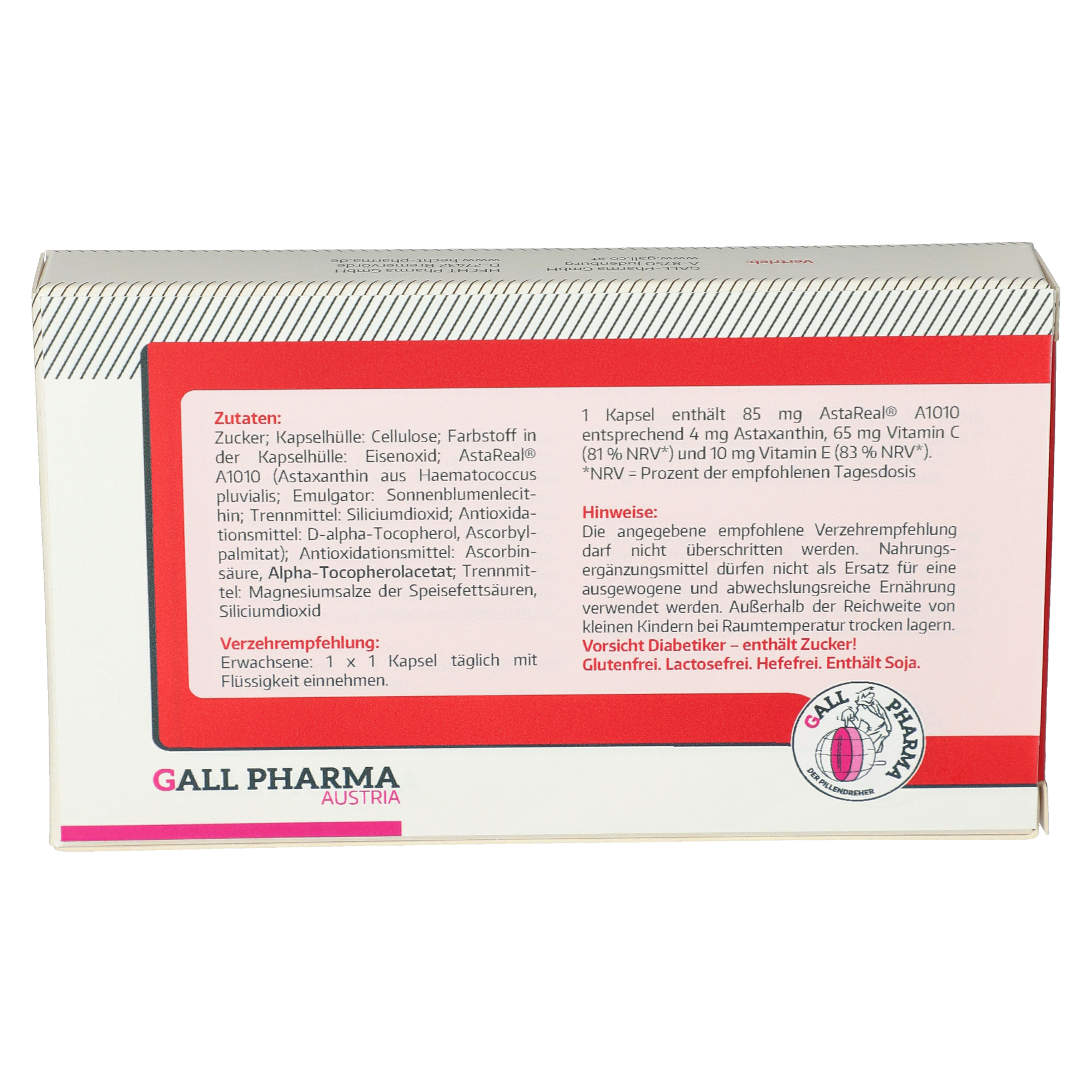1 Kapsel enthält 85 mg AstaReal® A1010 entsprechend 4 mg Astaxanthin, 65 mg Vitamin C (81 % NRV*) und 10 mg Vitamin E (83 % NRV*).