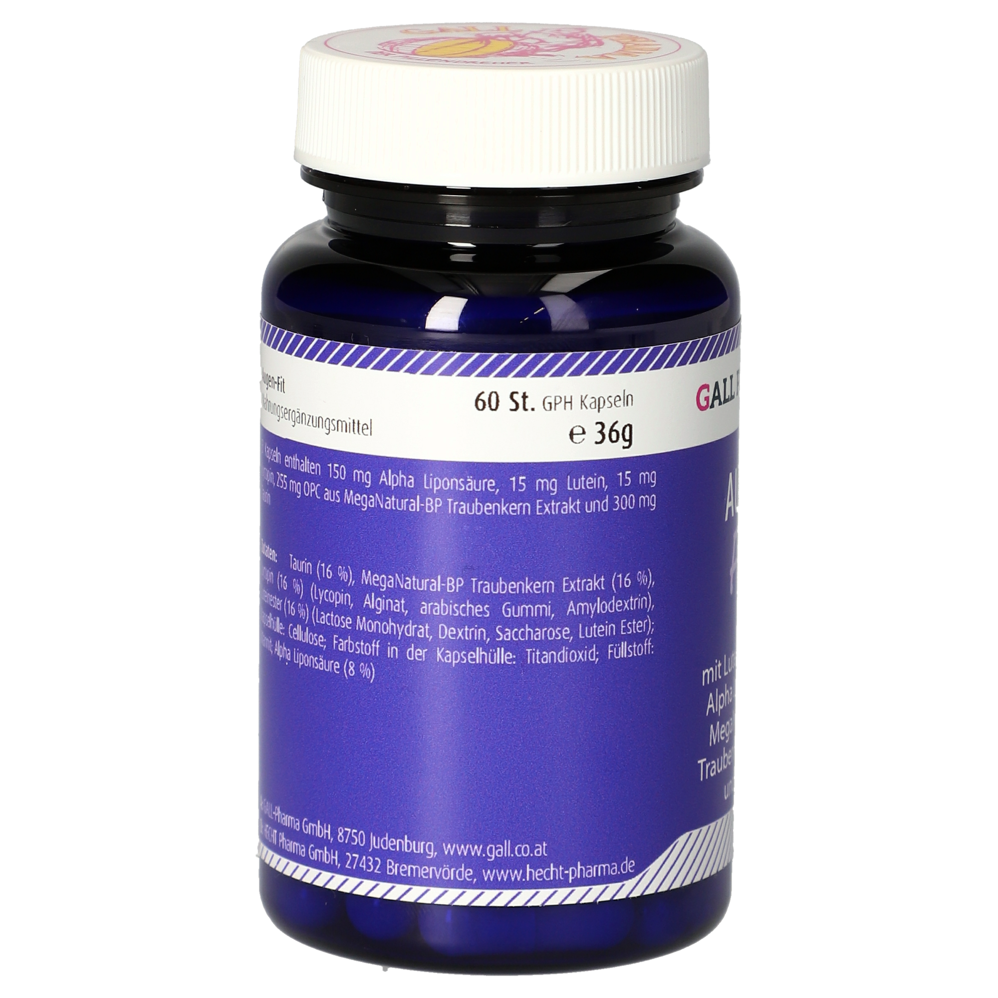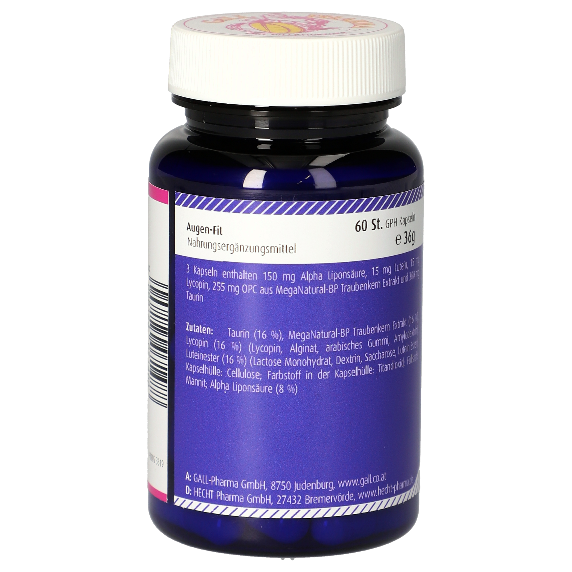 3 Kapseln enthalten 150 mg Alpha Liponsäure, 15 mg Lutein, 15 mg Lycopin, 255 mg OPC aus MegaNatural®-BP Traubenkern Extrakt und 300 mg Taurin.