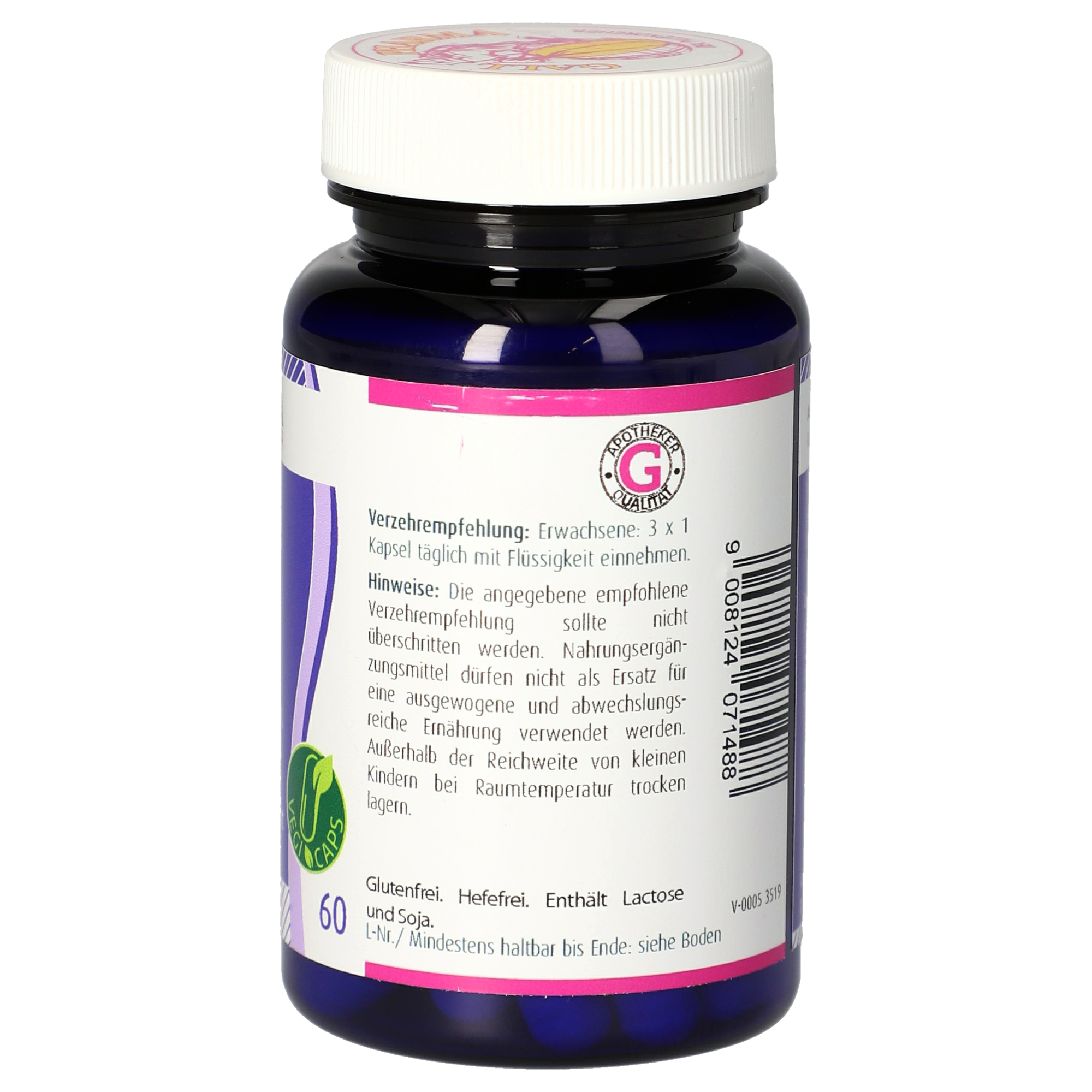 Die angegebene empfohlene Verzehrempfehlung darf nicht überschritten werden. Nahrungsergänzungsmittel dürfen nicht als Ersatz für eine ausgewogene und abwechslungsreiche Ernährung verwendet werden. Außerhalb der Reichweite von kleinen Kindern bei Raumtemperatur trocken lagern. Glutenfrei. Lactosefrei. Hefefrei.