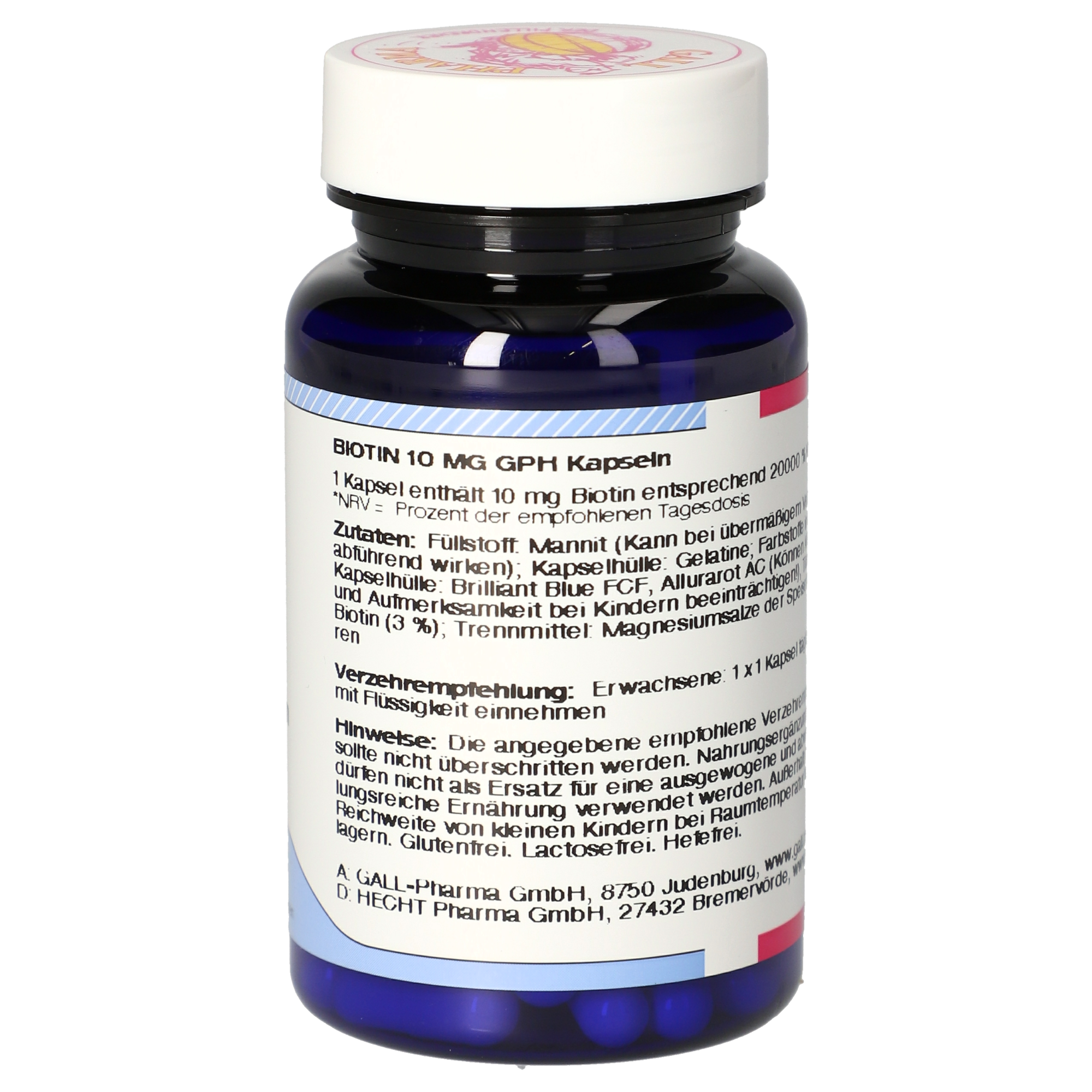 Füllstoff: Mannit**; Gelatine***; Farbstoff***: Calciumcarbonat, Patentblau V; Biotin; Trennmittel: Magnesiumsalze der Speisefettsäuren