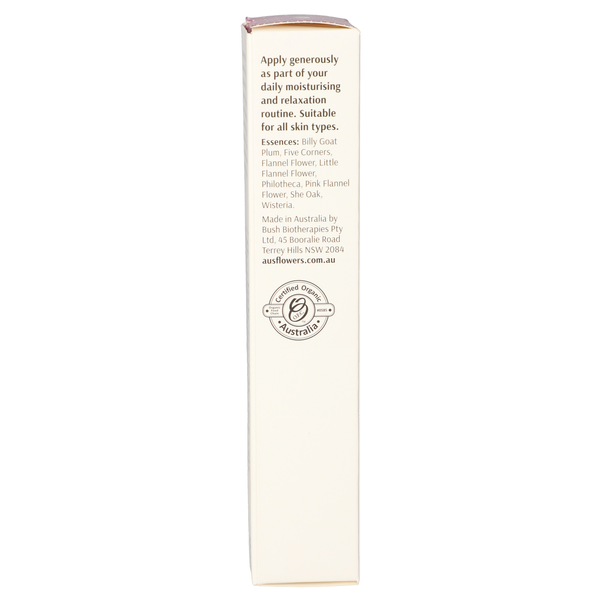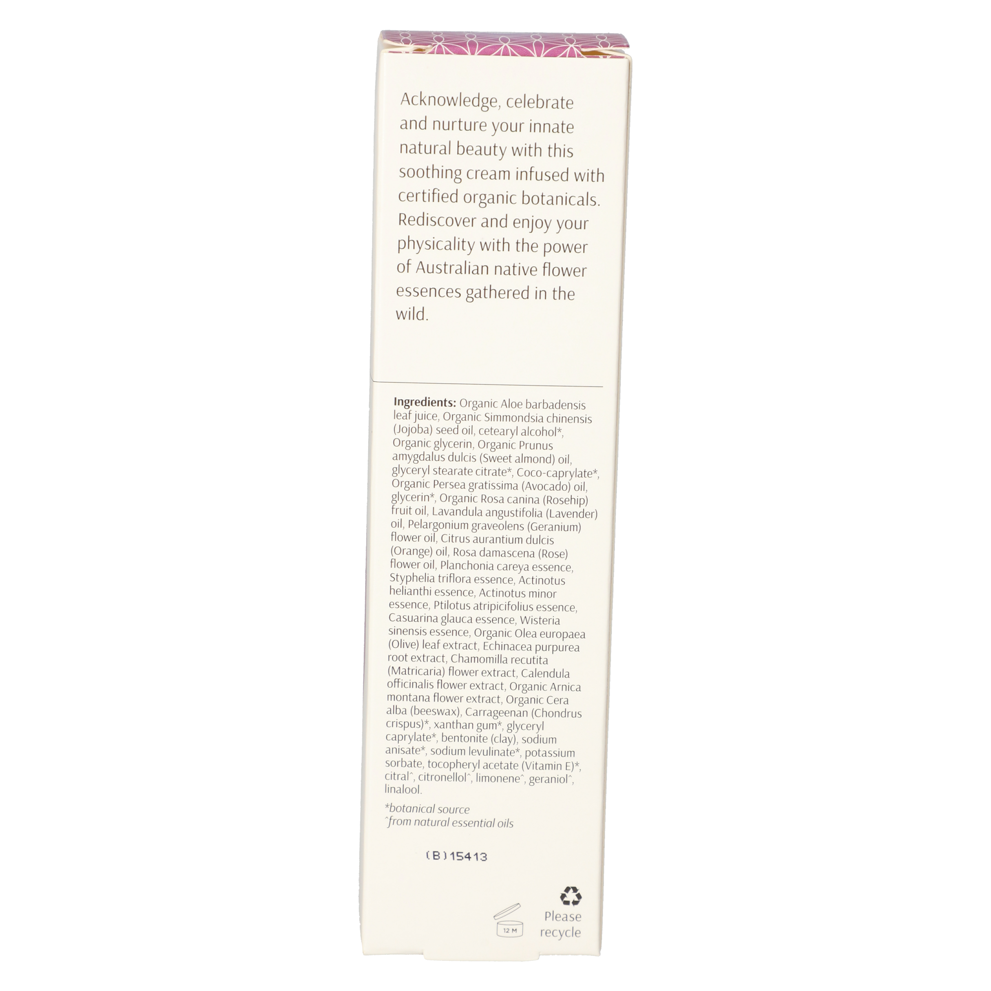 Organic Aloe barbadensis leaf juice, Organic Simmondsia chinensis (Jojoba) seed oil, cetearyl alcohol*, Organic glycerin, Organic Prunus amygdalus dulcis (Sweet almond) oil, glyceryl stearate citrate*, Coco-caprylate*, Organic Persea gratissima (Avocado) oil, glycerin*, Organic Rosa canina (Rosehip) fruit oil, Lavandula angustifolia (Lavender) oil, Pelargonium graveolens (Geranium) flower oil, Citrus aurantium dulcis (Orange) oil, Rosa damascena (Rose) flower oil, Planchonia careya essence, Styphelia triflora essence, Actinotus helianthi essence, Actinotus minor essence, Ptilotus atripicifolius essence, Casuarina glauca essence, Wisteria sinensis essence, Organic Olea europaea (Olive) leaf extract, Echinacea purpurea root extract, Chamomilla recutita (Matricaria) flower extract, Calendula officinalis flower extract, Organic Arnica montana flower extract, Organic Cera alba (beeswax), Carrageenan (Chondrus crispus)*, xanthan gum*, glyceryl caprylate*, bentonite (clay), sodium anisate*, sodium levulinate*, potassium sorbate, tocopheryl acetate (Vitamin E)*, citral^, citronellol^, limonene^, geraniol^, linalool.