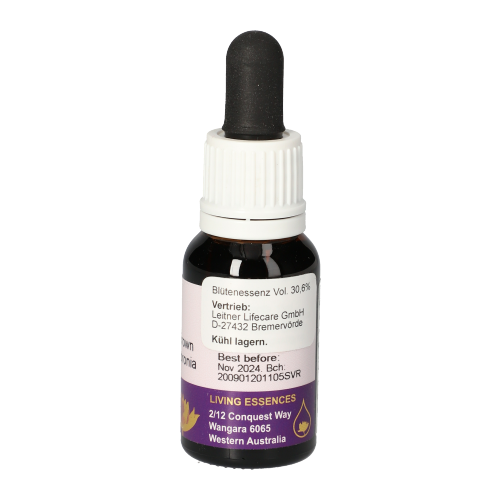 Die Brown Boronia Blütenessenz von Living Essences stärkt die Geduld und verhindert so Ausflippen und Frustration. Sie lässt einen bewusst werden, dass es immer einen Lösungsweg gibt. Anwendung: 6 x täglich 1 Tropfen unter die Zunge oder 2 x täglich ein halbes Glas Wasser mit je 6 Tropfen trinken. Essenzen können auch äußerlich angewandt werden, indem man sie Lotionen oder Salben beimischt oder sie ins Badewasser gibt, was besonders effektiv ist. Zusammensetzung: Wässriger Pflanzenextrakt Brown Boronia (Boronia Megastigma), gereinigtes Wasser, Brandy. Hinweise: Alkoholgehalt: 22 % Vol. Kühl lagern. Außerhalb der Reichweite von Kindern aufbewahren. Rechtlicher Hinweis: Essenzen und Schwingungsmittel sind im Sinne des Art. 2 der VO (EG) Nr. 178/2002 Lebensmittel und haben keine direkte, nach klassisch wissenschaftlichen Maßstäben nachgewiesene Wirkung auf Körper oder Psyche. Alle Aussagen beziehen sich ausschließlich auf energetische Aspekte wie Aura, Meridiane, Chakren etc.
