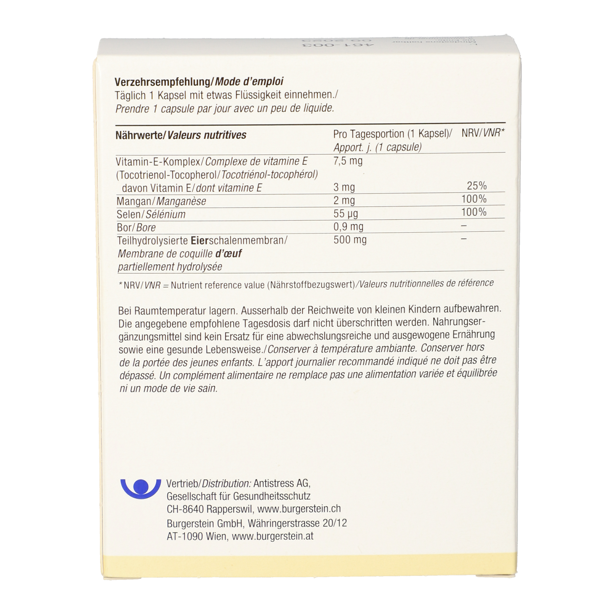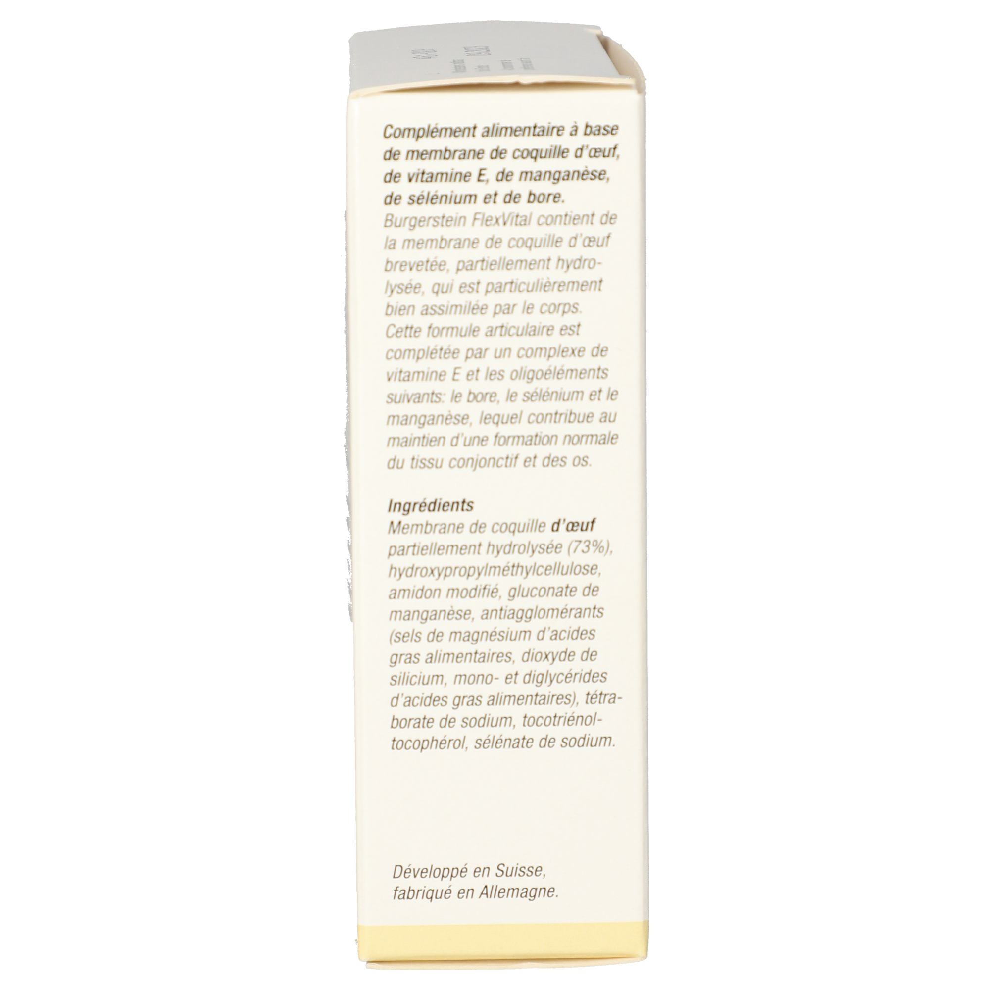 Teilhydrolysierte Eierschalenmembran (73 %), Hydroxypropylmethylcellulose, modifizierte Stärke, Mangangluconat, Trennmittel (Magnesiumsalze der Speisefettsäuren, Siliciumdioxid, Mono- und Diglyceride von Speisefettsäuren), Natriumtetraborat, Tocotrienol-Tocopherol, Natriumselenat.