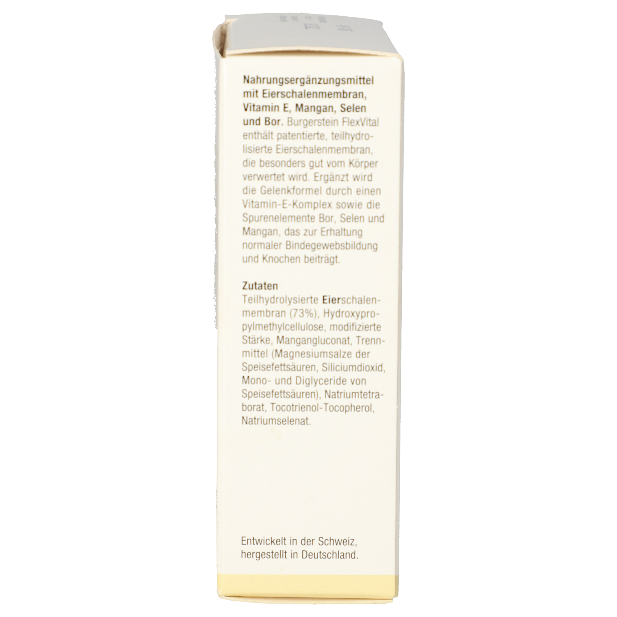 Gelenke, Knochen und Sehnen tragen uns durch das Leben. Für uns ist es ganz normal, dass wir Treppen steigen, wandern oder Sport treiben können. Und so soll es auch bleiben. Burgerstein Flex Vital enthält eine patentierte, teilhydrolysierte Eierschalenmembran, die besonders gut vom Körper verwertet wird. Diese enthält eine Vielzahl an natürlichen Inhaltsstoffen, wie Kollagen (Typ I, V und X) & Chondroitinsulfat, Glucosamin & Hyaluronsäure, Dermatansulfat & Keratansulfat, Lysozyme & Desmosin, Isodesmosin (Aminosäuren für Elastin), Methionin und Cystein (schwefelhaltige Aminosäuren) sowie Beta-Wachstumsfaktoren. Ergänzt wird die Gelenkformel durch einen natürlichen Vitamin-E-Komplex sowie die Spurenelemente Bor, Selen und Mangan.