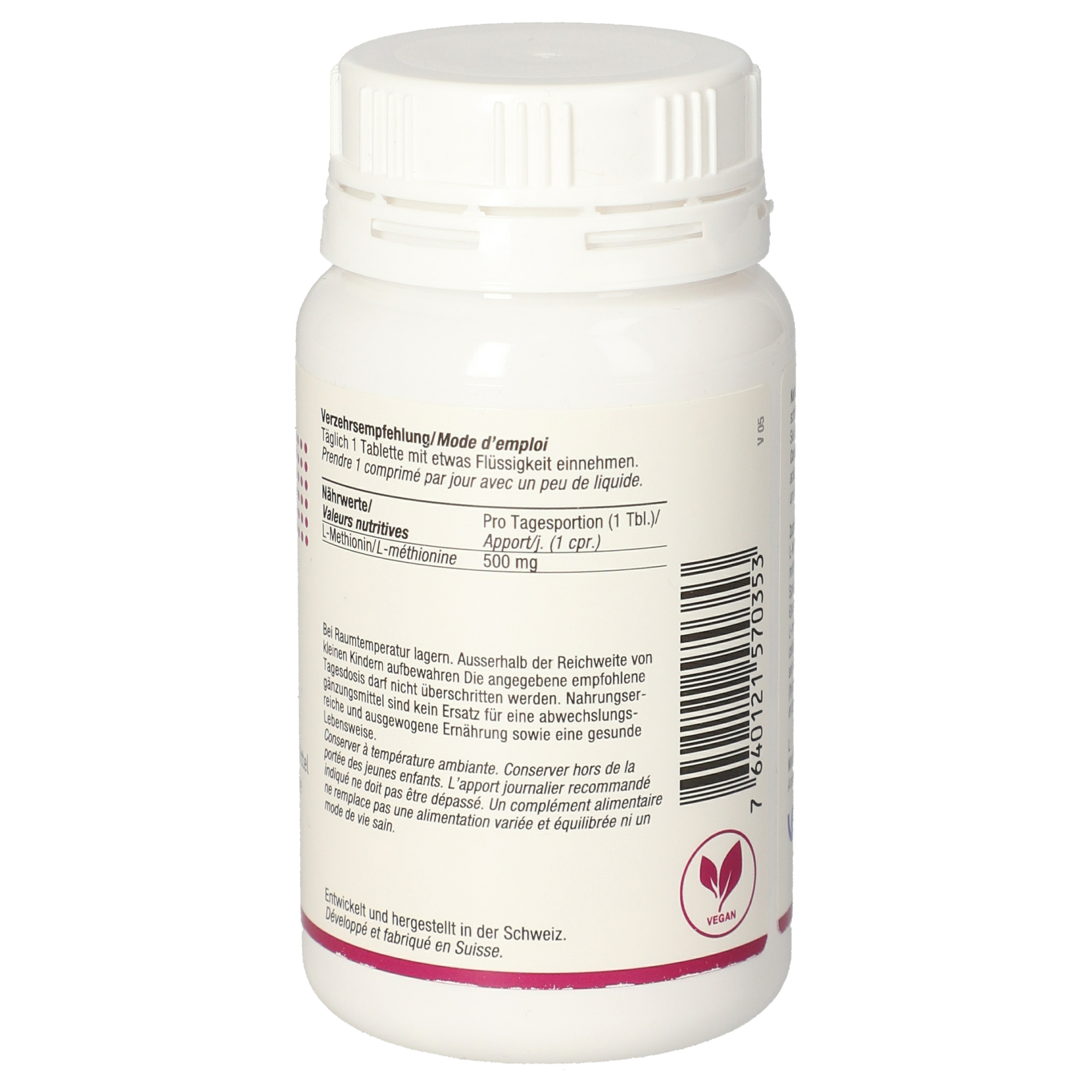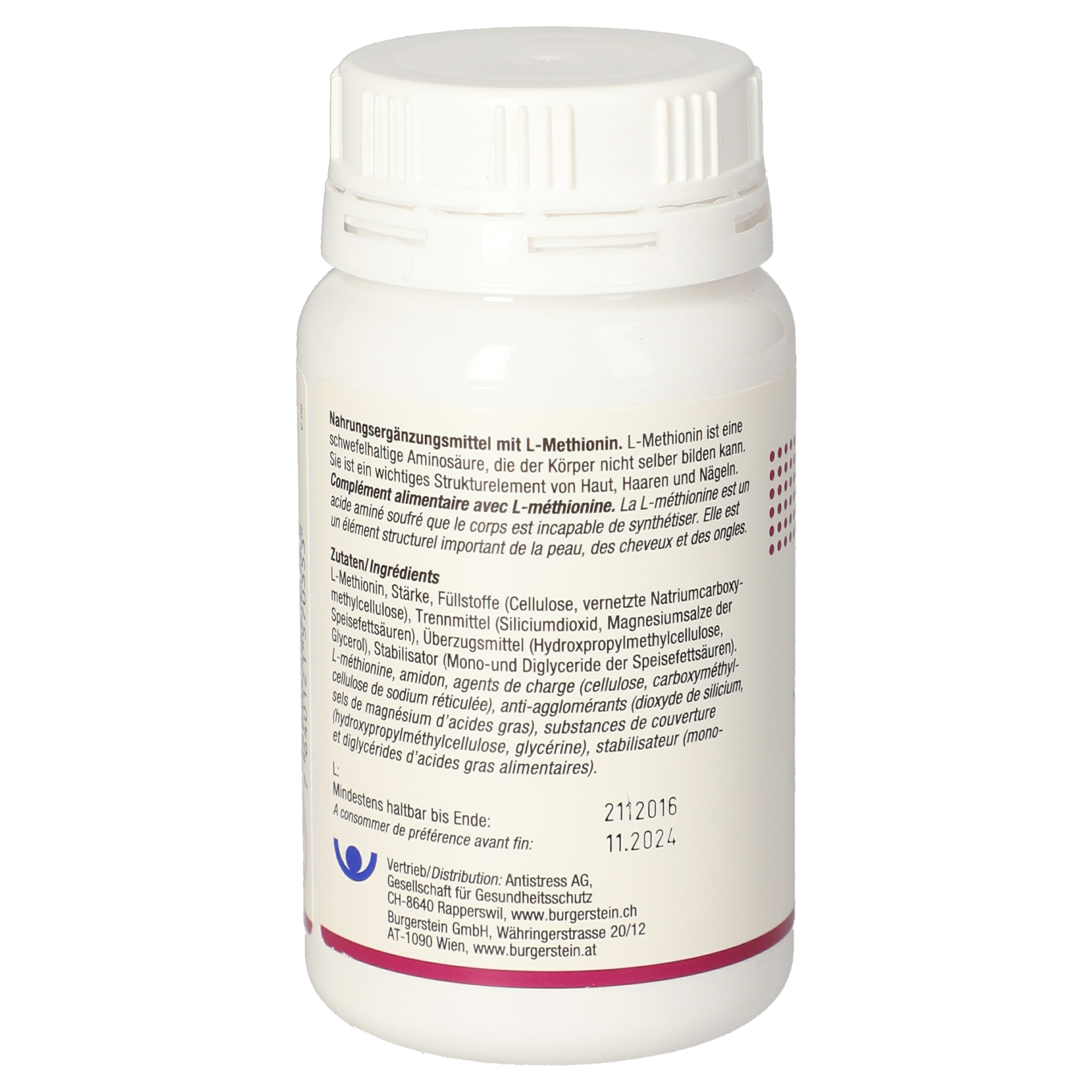 Burgerstein L-Methionin enthält pro Tablette 500 mg L-Methionin. L-Methionin ist die einzige essenzielle, schwefelhaltige Aminosäure, die der Körper nicht selbst bilden kann und daher mit der Nahrung zugeführt werden muss. Methionin trägt dazu bei, übermäßige Fetteinlagerungen in der Leber zu vermeiden. Es unterstützt zusätzlich die Regeneration der Leber und Nieren und besitzt eine harnsäuernde Wirkung. Es wirkt antioxidativ und kann Schwermetalle, beispielsweise Blei, sowie Histamin und Ammoniak entgiften bzw. deren Abbau beschleunigen und wird für den Stoffwechsel von Selen benötigt.