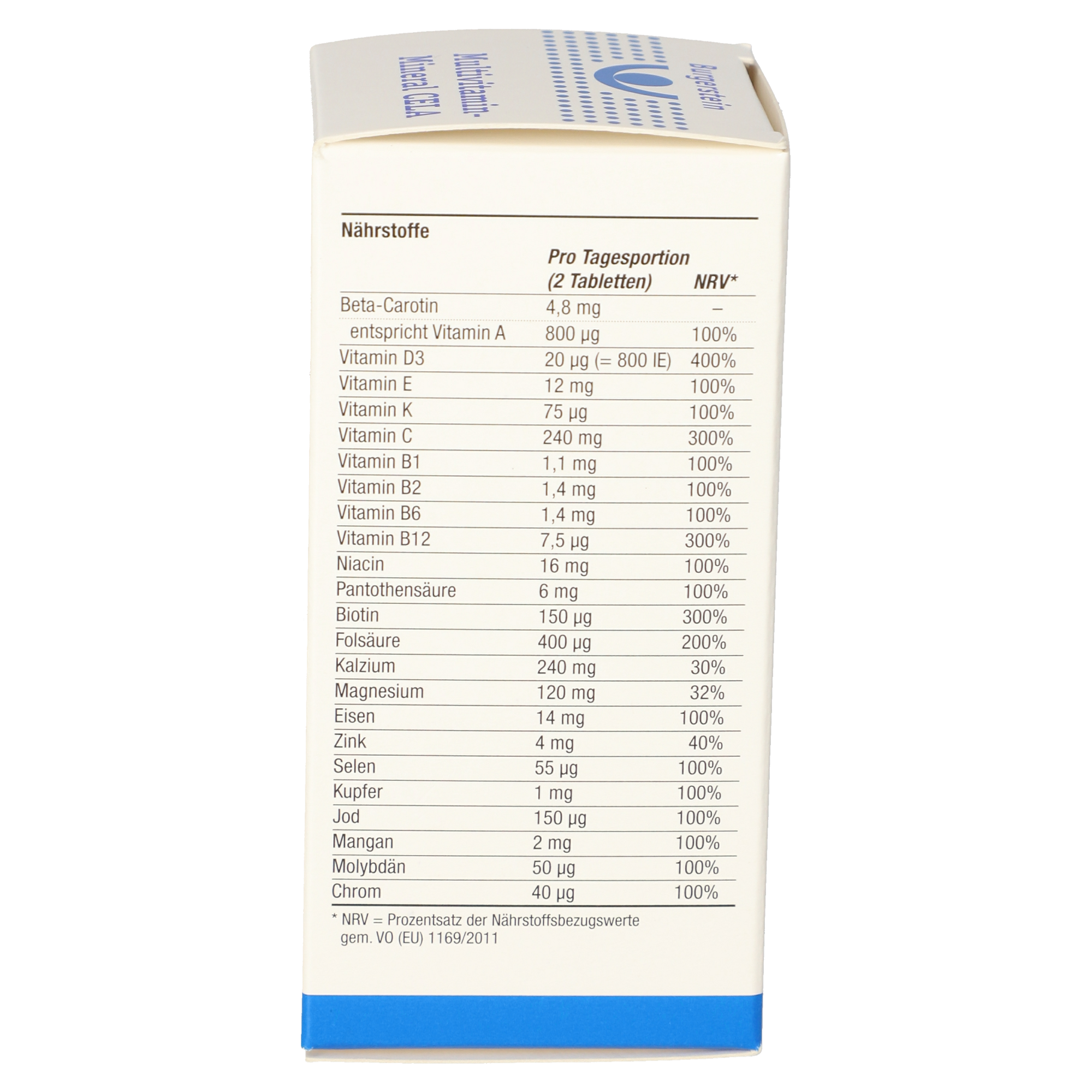 Calciumsalze der Orthophosphorsäure, Füllstoffe (Cellulose, Natrium-Carboxymethylcellulose), L-Ascorbinsäure, Magnesiumoxid, Trennmittel (Speisefettsäuren, Siliciumdioxid, Magnesiumsalz der Speisefettsäuren), Überzugsmittel (Hydroxypropylmethylcellulose, Polydextrose, Calciumcarbonat, Talkum, mittelketige Triglyceride), Titandioxid, Triglyceride), Magnesiumbisglycinat, gemischte Tocopherole, Eisenfumarat, D-alpha-Tocopherylsäuresuccinat, Calciumbisglycinat, Mangangluconat, Nicotinamid, Zinkbisglycinat, Kupfergluconat, Calcium-D-pantothenat, Farbstoffe (Eisenoxide und -hydroxide), Beta-Carotin, Pyridoxin-5’-phosphat, Riboflavin, Thiaminmononitrat, Pteroylglutaminsäure, Chrompicolinat, Kaliumiodid, D-Biotin, Natriumselenat, Natriummolybdat, Phytomenadion, Cholecalciferol, Cyanocobalamin.