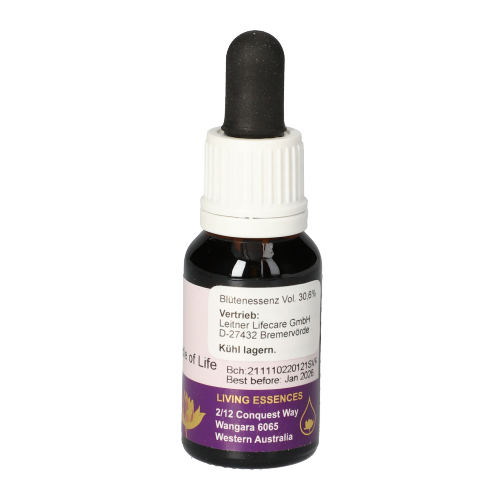 Diese Blütenessenz hilft, sensibler und rücksichtsvoll zu werden und lehrt, sich um andere Menschen zu sorgen. Diese Essenz ist nützlich für diejenigen, die jegliche Sensibilität gegenüber anderen ersticken, für diejenigen, die nicht in der Lage sind, Empathie zu empfinden und sich nur um sich selbst zu kümmern, für diejenigen, die sich einen Schutzpanzer geschaffen haben und glauben, dass sie autark sein können. Anwendung: 6 x täglich 1 Tropfen unter die Zunge oder 2 x täglich ein halbes Glas Wasser mit je 6 Tropfen trinken. Essenzen können auch äußerlich angewandt werden, indem man sie Lotionen oder Salben beimischt oder sie ins Badewasser gibt, was besonders effektiv ist. Zusammensetzung: Wässriger Pflanzenextrakt Red Leschenaultia, gereinigtes Wasser, Brandy. Hinweise: Alkoholgehalt: 22% Vol. Kühl lagern. Außerhalb der Reichweite von Kindern aufbewahren. Rechtlicher Hinweis: Essenzen und Schwingungsmittel sind im Sinne des Art. 2 der VO (EG) Nr. 178/2002 Lebensmittel und haben keine direkte, nach klassisch wissenschaftlichen Maßstäben nachgewiesene Wirkung auf Körper oder Psyche. Alle Aussagen beziehen sich ausschließlich auf energetische Aspekte wie Aura, Meridiane, Chakren etc.
