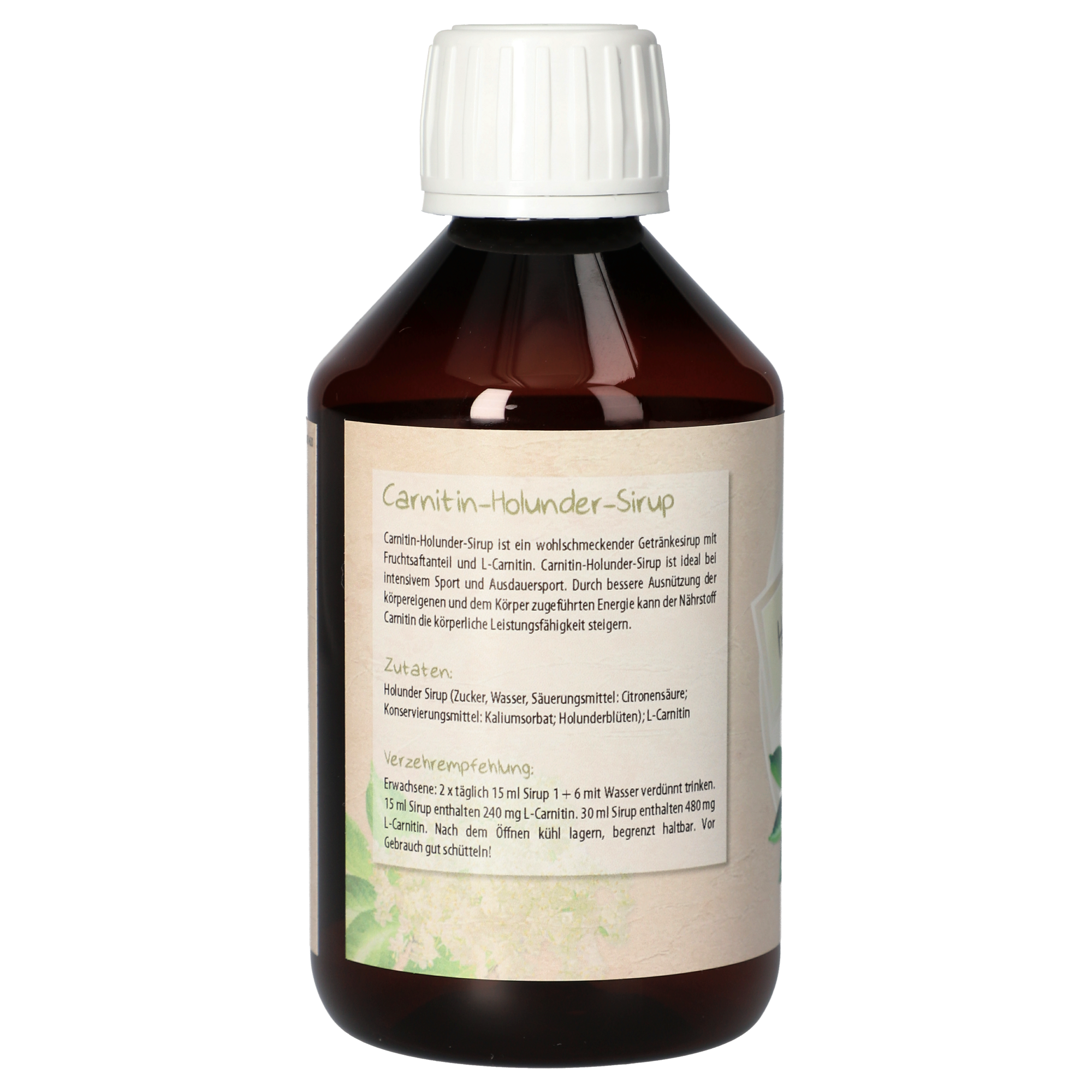 Holunder Sirup (Zucker, Wasser, Säuerungsmittel: Citronensäure; Konservierungsmittel: Kaliumsorbat; Holunderblüten); L-Carnitin