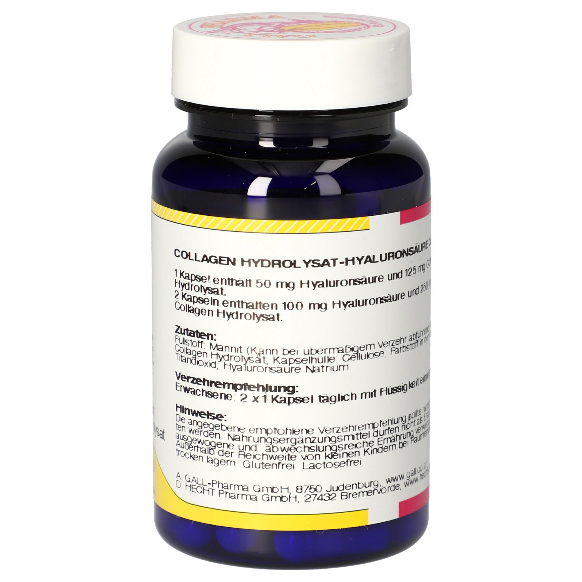 2 Kapseln enthalten 100 mg Hyaluronsäure und 250 mg Collagen Hydrolysat.