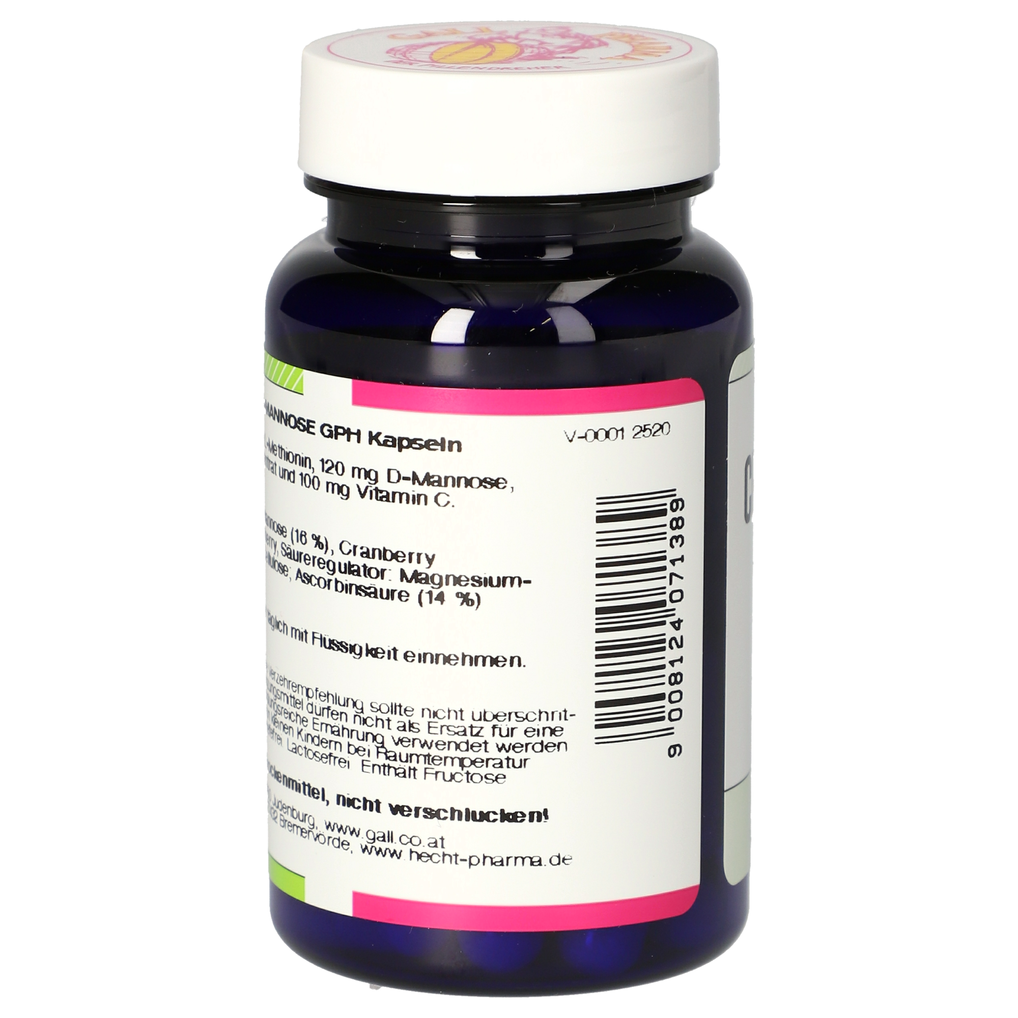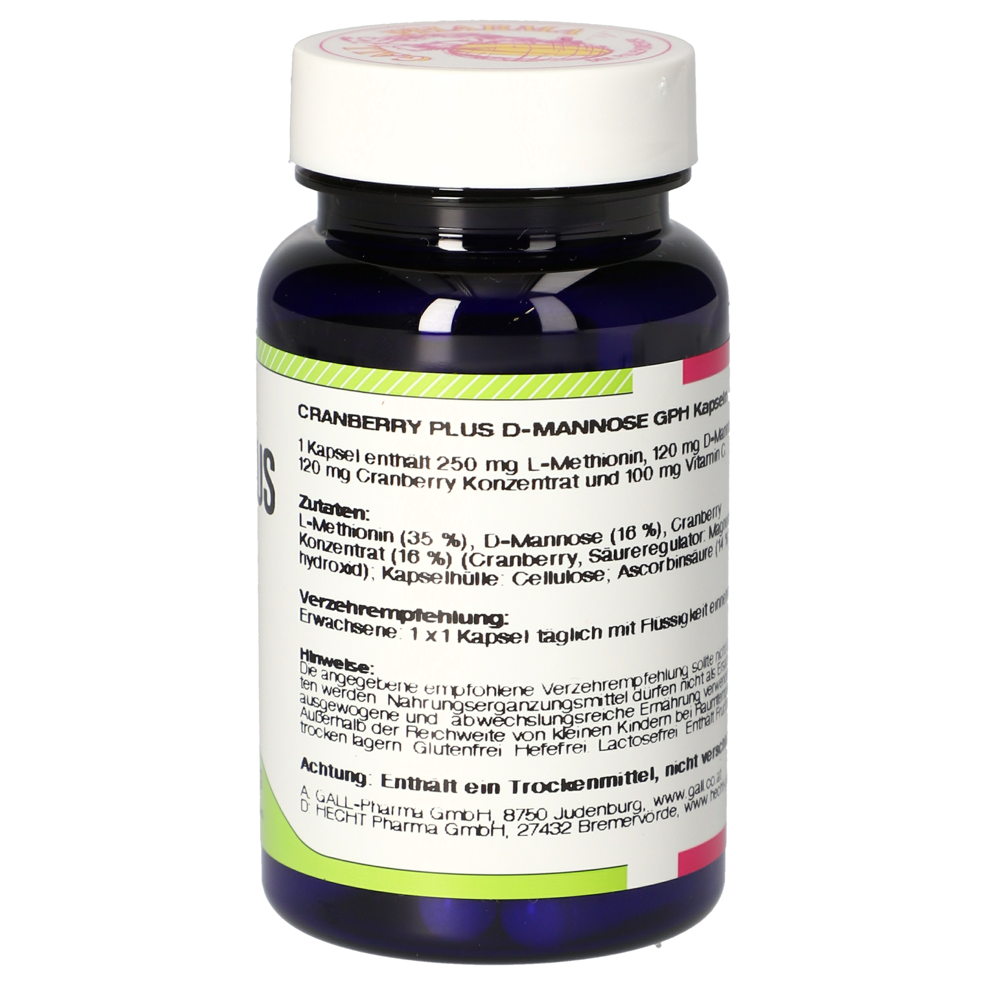 1 Kapsel enthält 250 mg L-Methionin, 120 mg D-Mannose, 120 mg Cranberry Extrakt und 100 mg Vitamin C (125% NRV*).