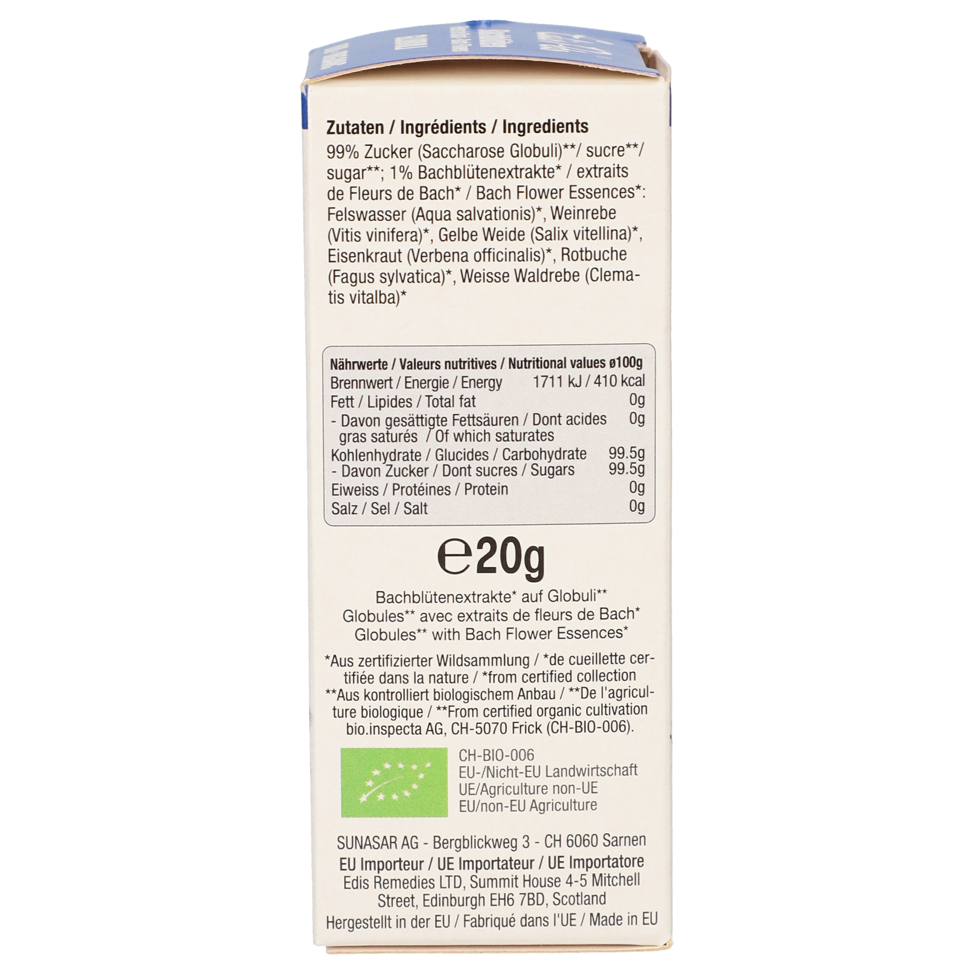 Die Kügelchen sind Original homöopathische Zuckerglobuli in ultrafeiner Qualität, informiert mit Bachblüten Rock Water, Vine, Willow, Vervain, Beech, Clematis.