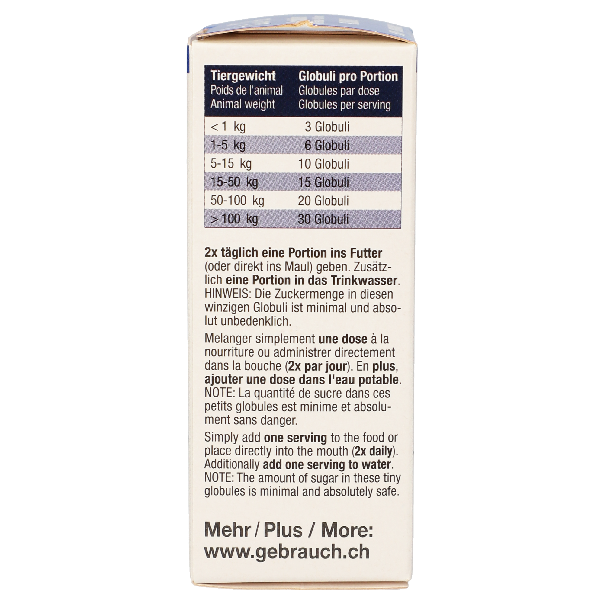Einfach 3-4x täglich dem Futter bzw. Wasser beigeben oder in das Maul bzw. die Lefzen geben.