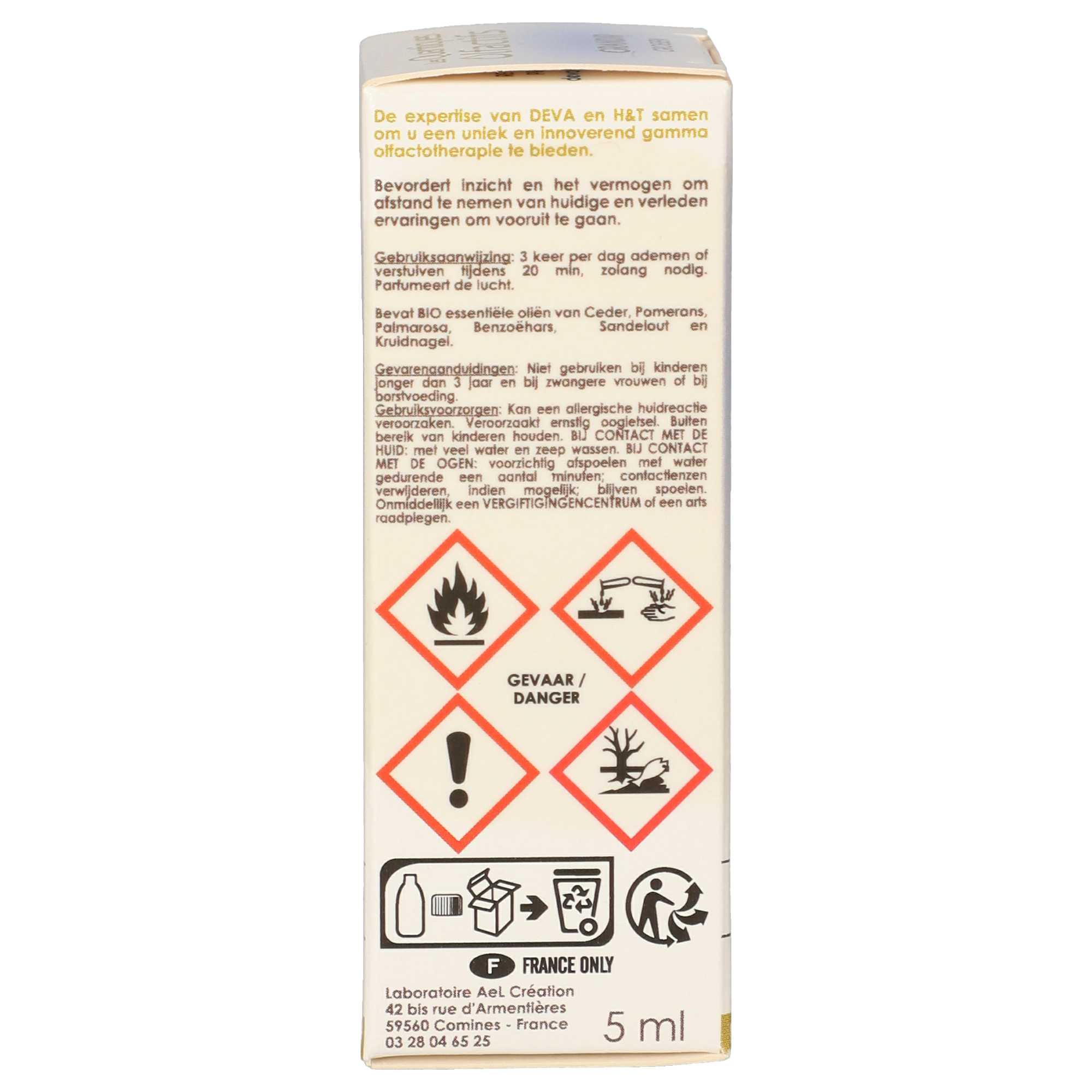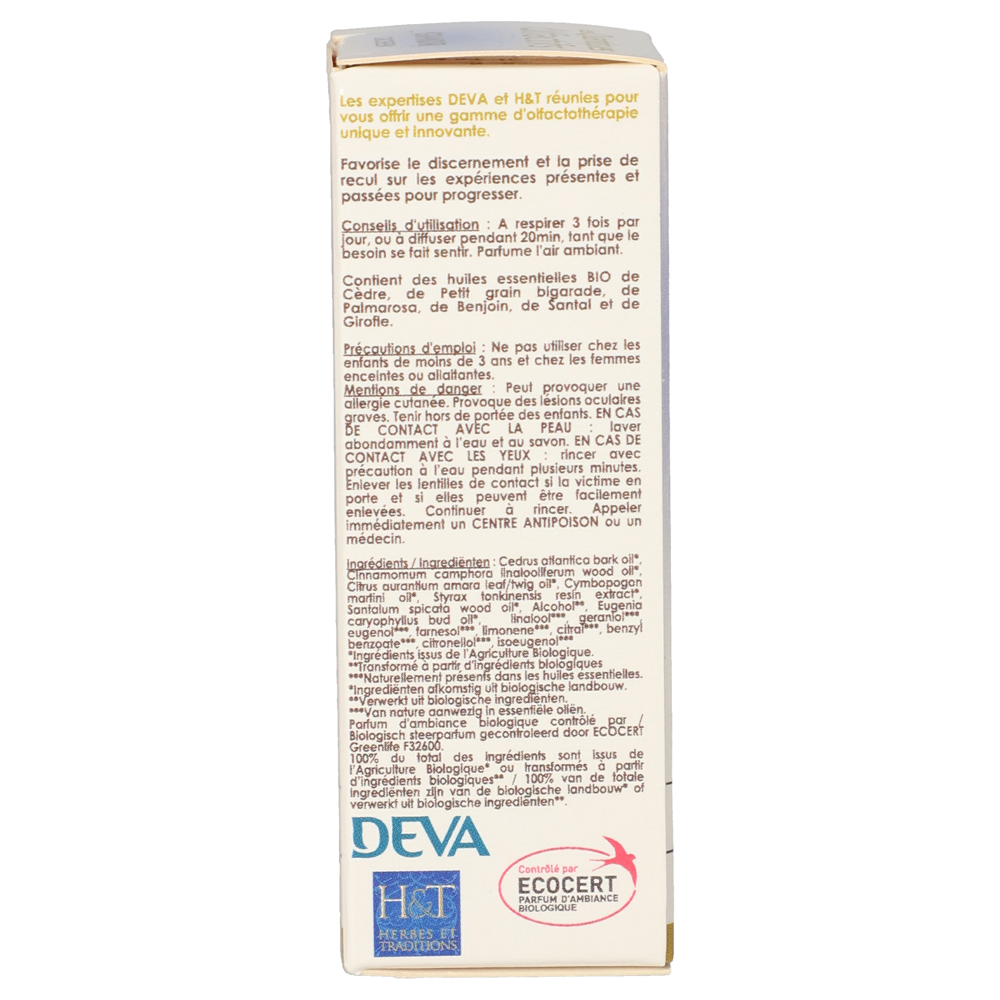 Biologischer Raumduft, enthält BIO ätherische Öle von Zedernholz, Hô-Holz, Petit grain bigarade, Palmarosa, Benzoe Siam, Sandelholz und Gewürznelken. Inhaltsstoffe sind natürlichen Ursprungs aus biologischem Anbau, kontrolliert von Ecocert Greenlife F32600