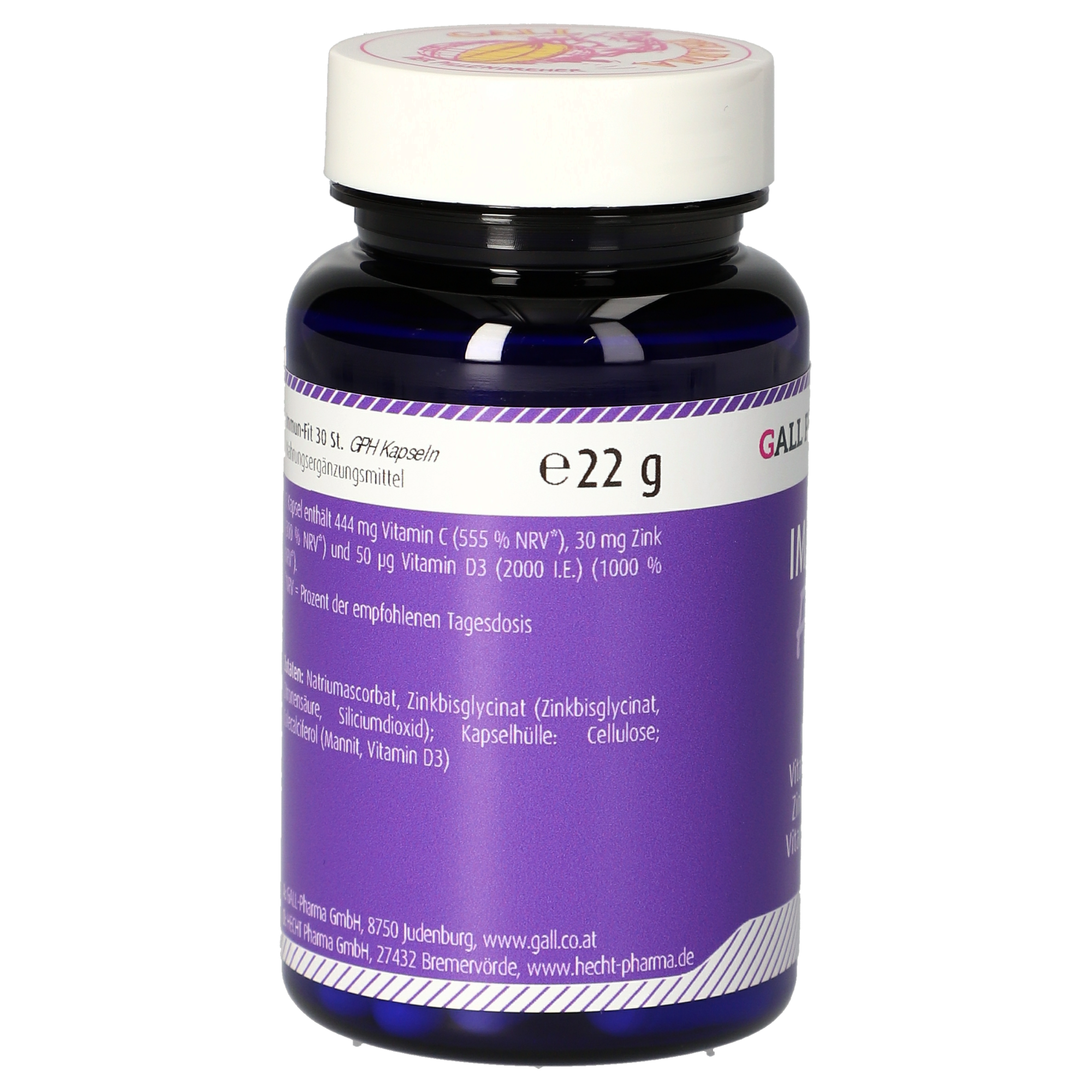 1 Kapsel enthält 450 mg Vitamin C (562 % NRV*), 30 mg Zink (300 % NRV*) und 125 µg Vitamin D3 (5000 I.E.) (2500 % NRV*).