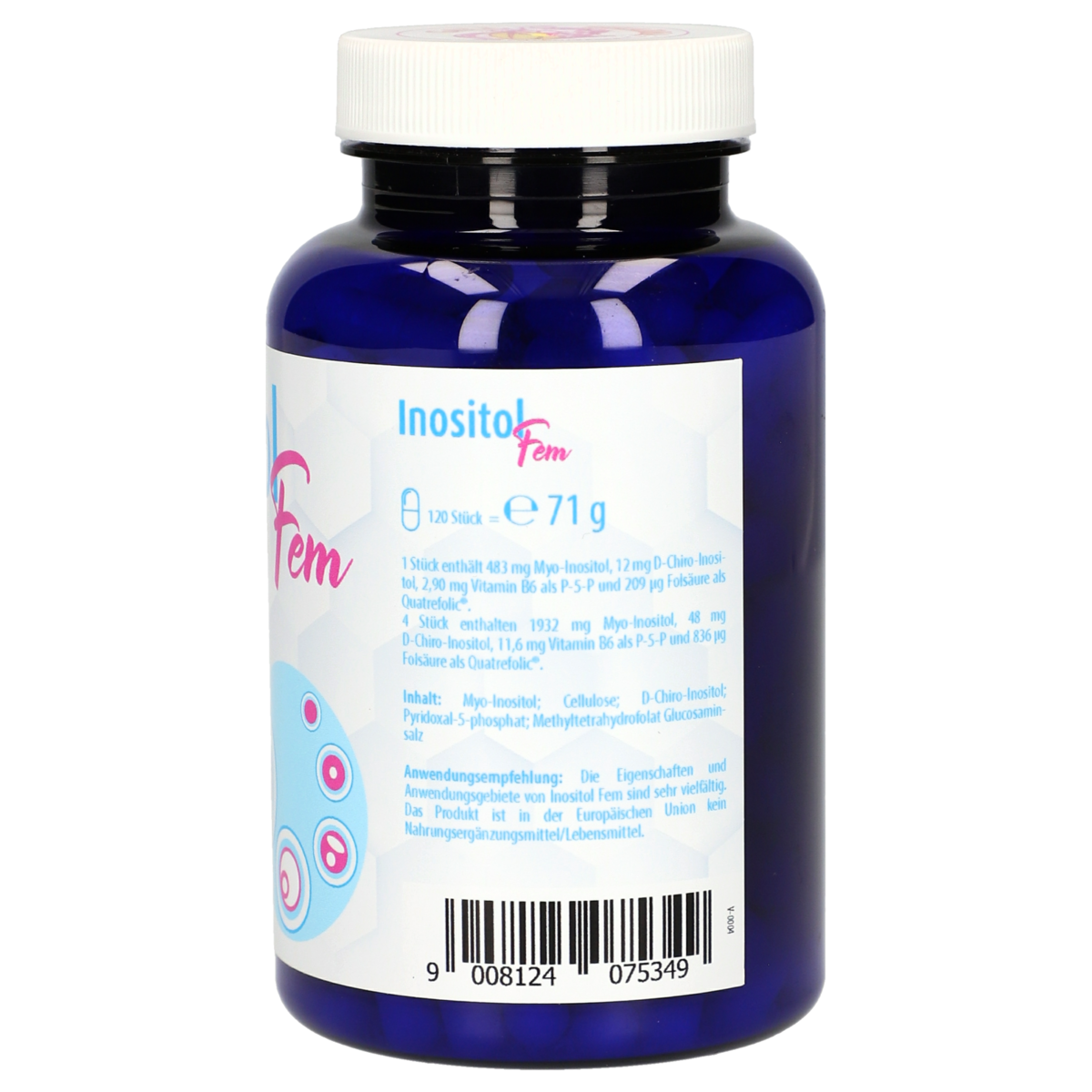 4 Stück enthalten 1932 mg Myo-Inositol, 48 mg D-Chiro-Inositol, 11,6 mg Vitamin B6 als P-5-P und 836 μg Folsäure als Quatrefolic®.