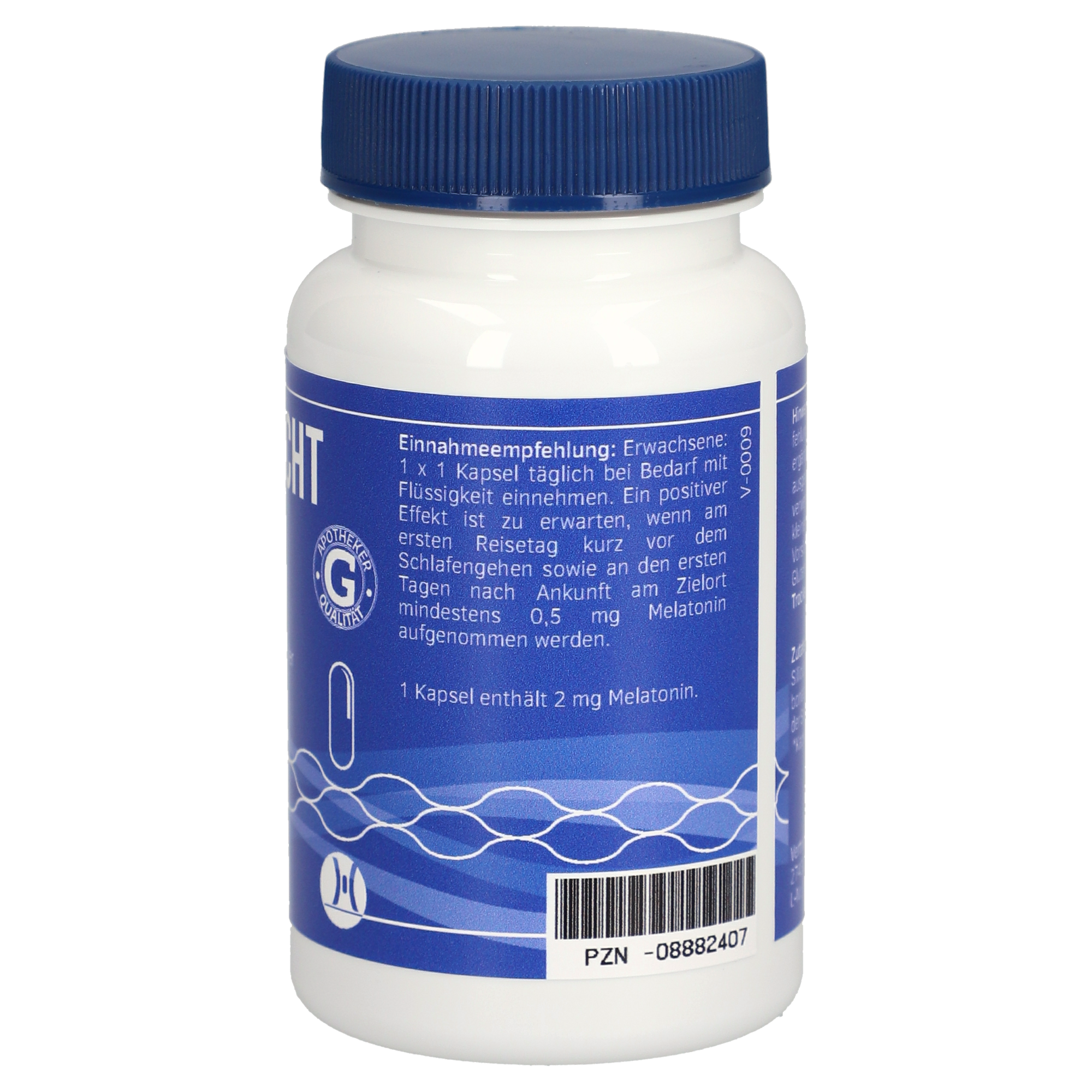 Ein Jetlag wird durch eine Störung des Biorhythmus als Folge von Langstreckenflügen in andere Zeitzonen verursacht. Reisende empfinden diese Unregelmäßigkeit im Schlaf-Wach-Rhythmus oft als sehr unangenehm, da eine vollkommene Erholung häufig erst nach Tagen einsetzt. Der Schlaf-Wach-Rhythmus des Körpers wird jedoch durch das Hormon Melatonin, das von der Zirbeldrüse im Gehirn produziert wird, gesteuert: Mit einsetzender Dunkelheit erhöht der Körper die Produktion des schlaffördernden Melatonins; er wird auf Schlaf eingestimmt. Sowohl auf Reisen, als auch zu Hause kann dieses natürlich vorkommende Hormon gegen Müdigkeit am Folgetag eingesetzt werden: Melatonin trägt zur Linderung der subjektiven Gefühle von Jetlag und zur Verkürzung der Einschlafzeit bei. Dieser positive Effekt wird durch die Einnahme von mindestens 1 mg Melatonin unmittelbar vor dem Schlafengehen erzielt. Anwendungsgebiete: Zur Linderung des subjektiven Jetlag-Empfindens Verzehrempfehlung: Erwachsene: 1 x 1 Kapsel täglich bei Bedarf mit Flüssigkeit einnehmen. Ein positiver Effekt ist zu erwarten, wenn am ersten Reisetag kurz vor dem Schlafengehen sowie an den ersten Tagen nach Ankunft am Zielort mindestens 0,5 mg aufgenommen werden. 1 Kapsel enthält 2,5 mg Melatonin. Zusammensetzung: Tomaten Pulver (Tomaten Pulver, Siliciumdioxid); Gelatine*; Farbstoff*: Calciumcarbonat; Melatonin; Trennmittel: Magnesiumsalze der Speisefettsäuren *Kapselhülle Hinweise: Die angegebene empfohlene Verzehrempfehlung darf nicht überschritten werden. Nahrungsergänzungsmittel dürfen nicht als Ersatz für eine ausgewogene und abwechslungsreiche Ernährung verwendet werden. Außerhalb der Reichweite von kleinen Kindern bei Raumtemperatur trocken lagern. Achtung: Enthält ein Trockenmittel, nicht verschlucken! Glutenfrei. Lactosefrei. Hefefrei.