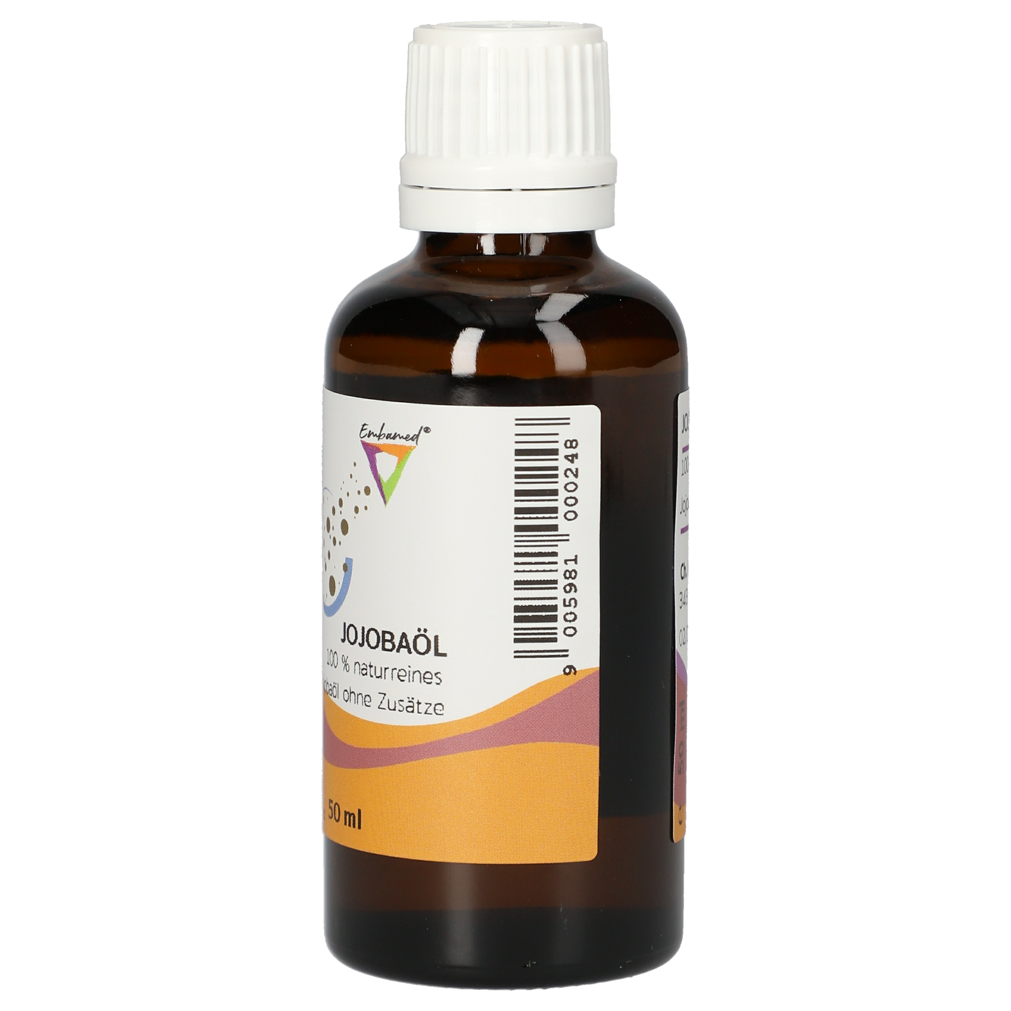 Jojobaöl Embamed® wird aus den Früchten des Jojobastrauches (Simmondsia chinensis) gepresst. Streng genommen handelt es sich um ein Wachs mit einem Schmelzpunkt von ca. 7 °C. Es ist für alle Hauttypen zur Pflege geeignet. Aufgrund seines natürlichen Lichtschutzfaktors von 3 bis 4 wird es auch als Basis für Sonnenöle verwendet. Darüber hinaus wird es als Massageöl verwendet, es schützt vor Austrocknung und hinterlässt keinen schmierigen Film auf der Haut.