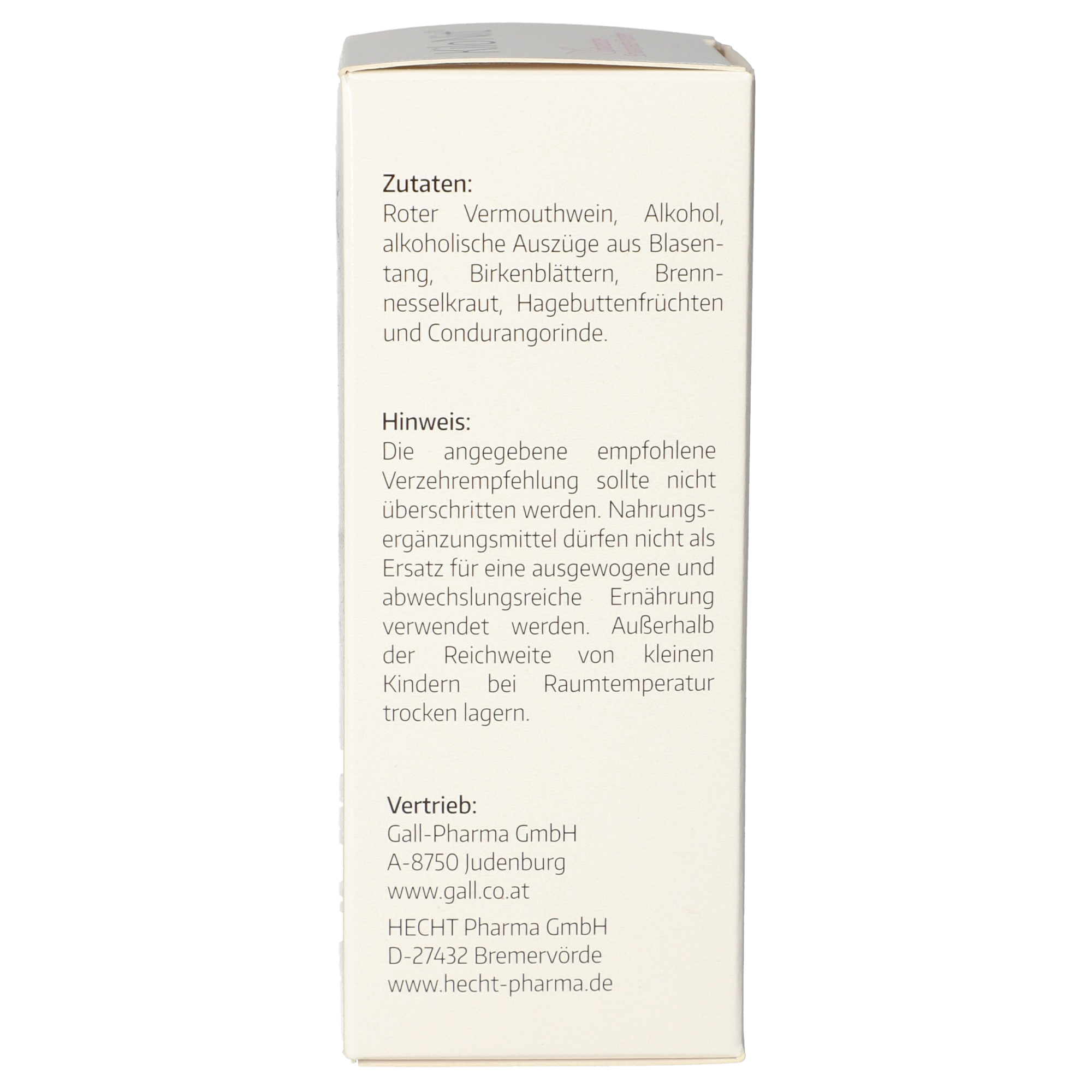 Roter Vermouthwein, Alkohol, alkoholische Auszüge aus Blasentang, Birkenblättern, Brennnesselkraut, Hagebuttenfrüchten, Condurangorinde