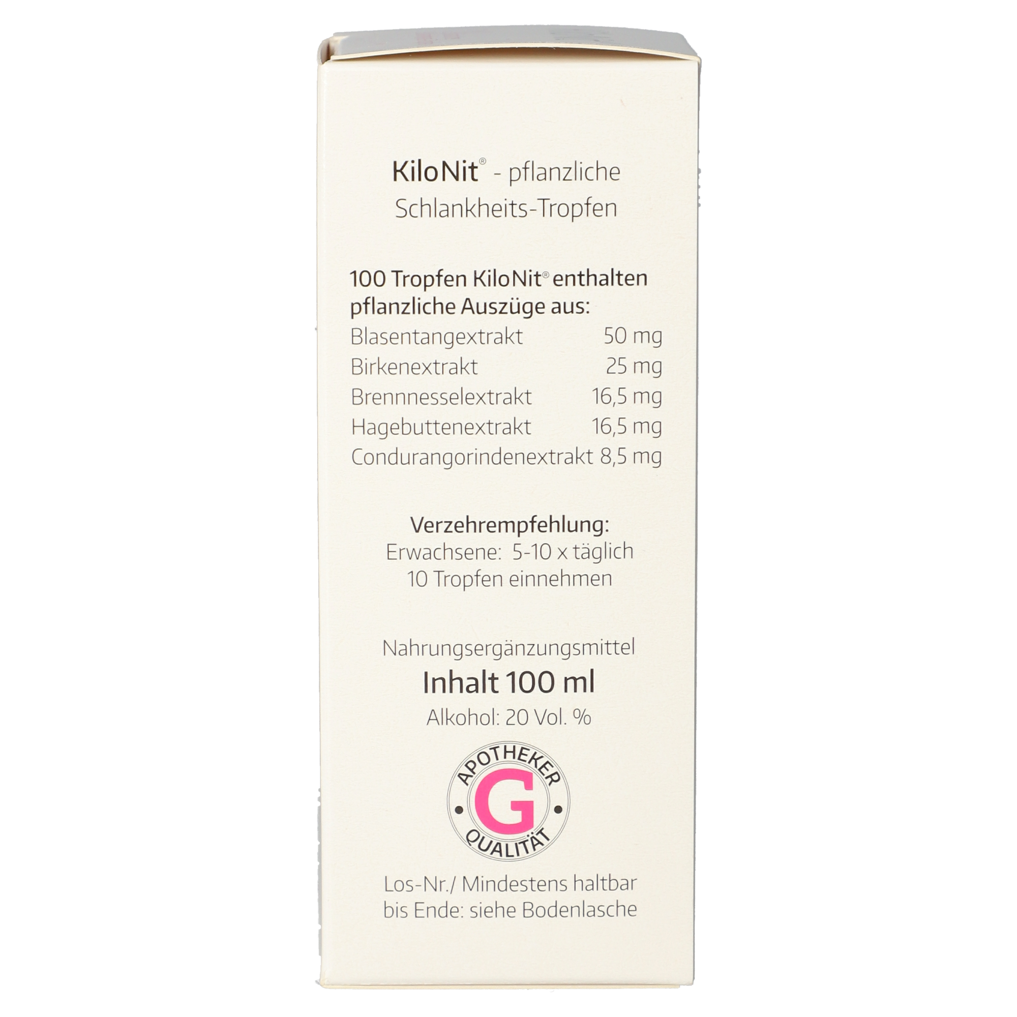 100 Tropfen KiloNit® enthalten pflanzliche Auszüge aus Blasentangextrakt 35 mg, Birkenextrakt 17,5 mg, Brennnesselextrakt 11,5 mg, Hagebuttenextrakt 11,5 mg und Condurangorindenextrakt 5,9 mg.