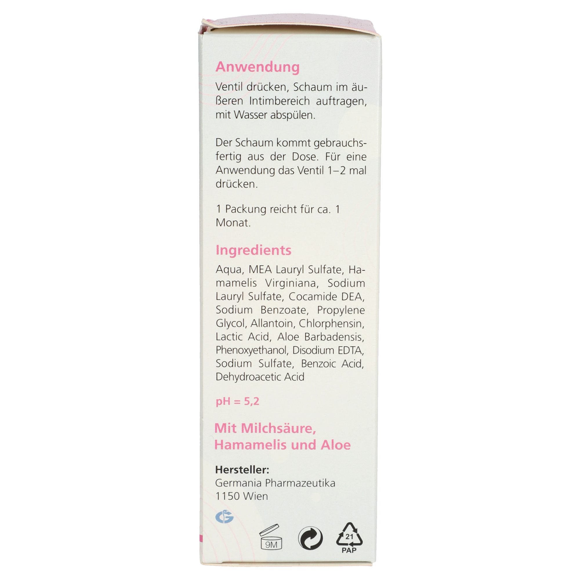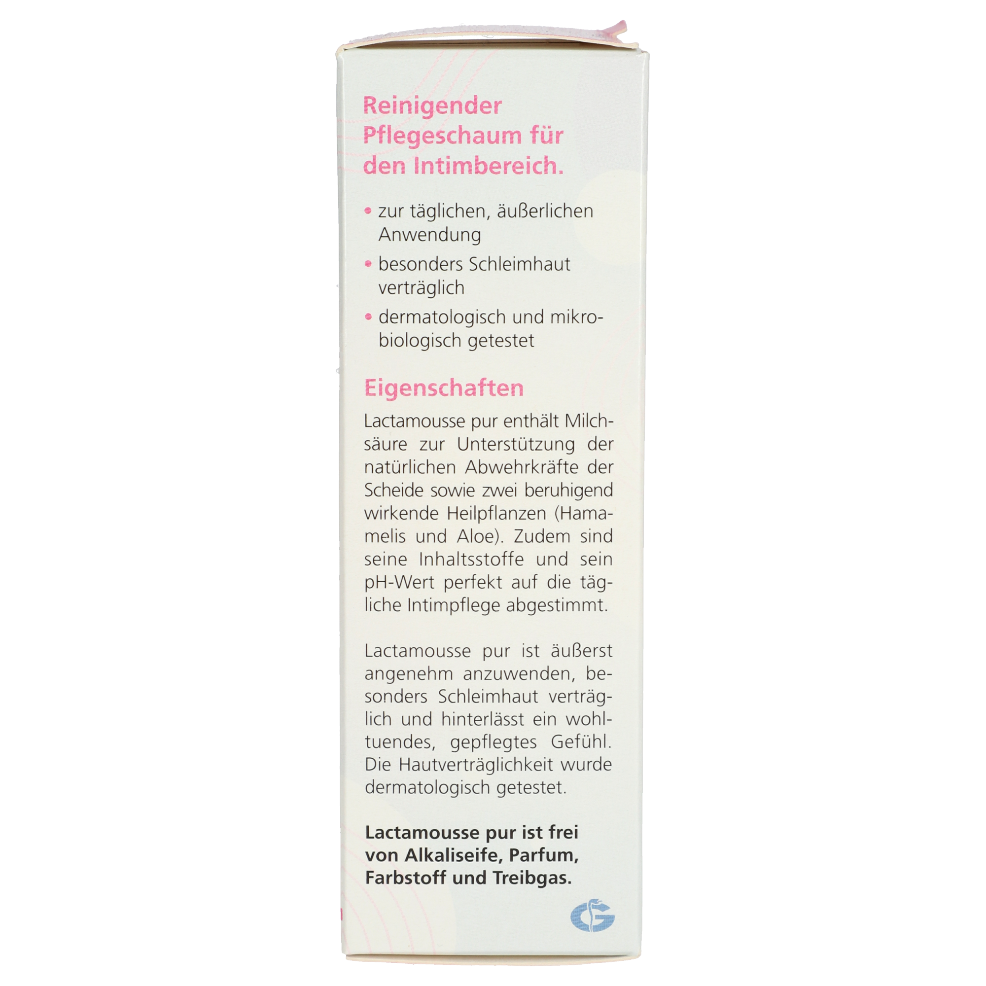 Der Schaum in Lactamousse® pur enthält Milchsäure. Durch die tägliche Intimpflege mit Lactamousse® pur führen Sie Ihrer Scheidenflora zusätzliche Milchsäure zu und unterstützen damit ihre natürliche Abwehrkraft. Lactamousse® pur hat einen pH-Wert ähnlich dem der Scheide. Daher erhält Lactamousse® pur das natürliche Gleichgewicht der Scheidenflora und unterstützt so ihre Funktion als Schutzbarriere gegen Krankheitserreger. Die beiden Heilpflanzen Hamamelis und Aloe haben beruhigende Eigenschaften und bewirken ein wohltuendes Zartheitsgefühl. Lactamousse® pur ist ein hochwertiges Produkt zur sanften Reinigung und wohltuenden Pflege im Intimbereich – für jeden Tag unter der Dusche. Sehr angenehm anzuwenden! Die Hautverträglichkeit wurde dermatologisch getestet. Anwendung: Ventil drücken, Schaum im äußeren Intimbereich auftragen, mit Wasser abspülen. Der Schaum kommt gebrauchsfertig aus der Dose. Zusammensetzung: Aqua, MEA lauryl sulfate, Hamamelis Virginiana, Sodium lauryl sulfate, Cocamide DEA, Sodium benzoate, Propylene glycol, Allantoin, Chlorphenesin, Lactic acid, Aloe Barbadensis, Phenoxyethanol, Disodium EDTA, Sodium sulfate, Benzoic acid, Dehydroacetic acid. Hinweise: Dermatologisch und mikrobiologisch getestet. Besonders schleimhautverträglich. Nicht schlucken. Für Kinder unzugänglich aufbewahren. Nicht über 25°C lagern. Nach dem auf dem Umkarton angegebenen Verfalldatum nicht mehr verwenden. Haltbarkeit nach erstmaligem Gebrauch: mind. 9 Monate. 1 Packung reicht für ca. 1 Monat. Frei von Alkaliseife, Parfum, Farbstoffen und Treibgas. Zudem sind seine Inhaltsstoffe und sein pH-Wert perfekt auf die tägliche Intimpflege abgestimmt.