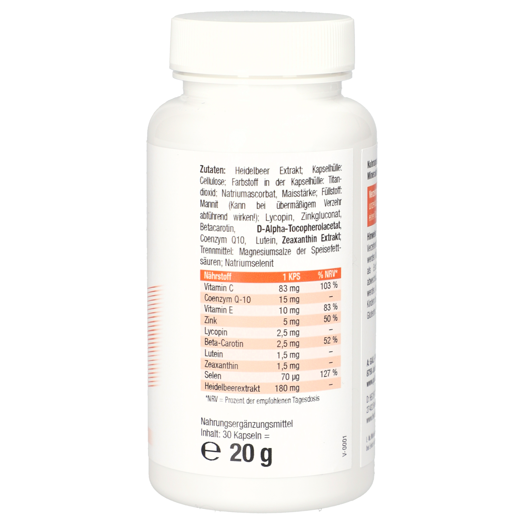 1 Kapsel enthält 83 mg Vitamin C (103 % NRV*), 15 mg Coenzym Q-10, 10 mg Vitamin E (83 % NRV*), 5 mg Zink (50 % NRV*), 2,5 mg Lycopin, 2,5 mg Beta-Carotin (52 % NRV*), 1,5 mg Lutein, 1,5 mg Zeaxanthin, 70 µg Selen (127 % NRV*), 180 mg Heidelbeerextrakt. *NRV = Prozent der empfohlenen Tagesdosis