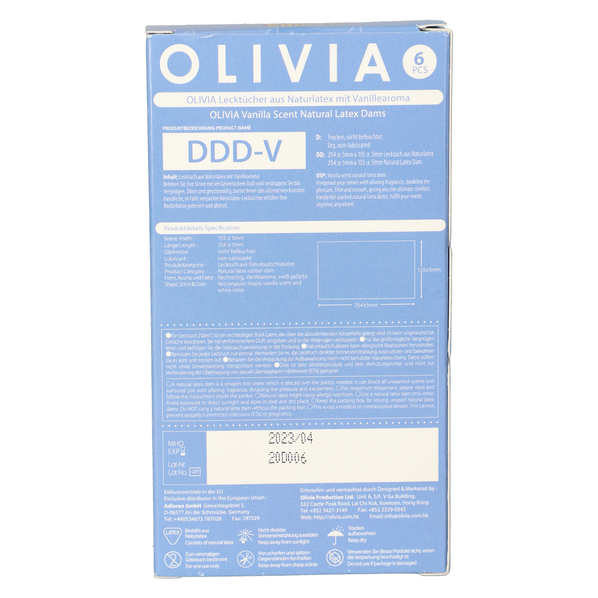 Die handlichen, in Folie verpackten Naturlatex-Lecktücher erfüllen Ihre Bedürfnisse nach sicherem Oralvergnügen jederzeit und überall. Ein Lecktuch ist ein rechteckiges Stück Latex und kann als Barriere zwischen Vagina oder Anus ungewünschte Gerüche blockieren, Sie mit verführerischem Duft umgeben und so das Vergnügen verdoppeln. Olivia Mix Dam Lecktücher enthalten je 1 Lecktuch in den Duftrichtungen Banane, Erdbeere, Traube, Schokolade, Vanille und Minze. Anwendung: Das Lecktuch wird beim Oralverkehr über die Vagina oder den Anus gelegt. Benutzen Sie jedes Lecktuch nur einmal. Zusammensetzung: Naturkautschuklatex. Hinweise: Für das größtmögliche Vergnügen lesen und befolgen Sie die Gebrauchsanweisung in der Packung. Naturkautschuklatex kann allergische Reaktionen hervorrufen. Vermeiden Sie es, das Lecktuch direkter Sonneneinstrahlung auszusetzen und bewahren Sie es kühl und trocken auf. Behalten Sie die Verpackung zur Aufbewahrung noch nicht benutzter Naturlatex-Dams. Dams sollten nicht ohne Umverpackung transportiert werden. Dies ist kein Medizinprodukt und kein Verhütungsmittel und nicht zur Verhinderung der Übertragung von sexuell übertragbaren Infektionen (STI) geeignet.