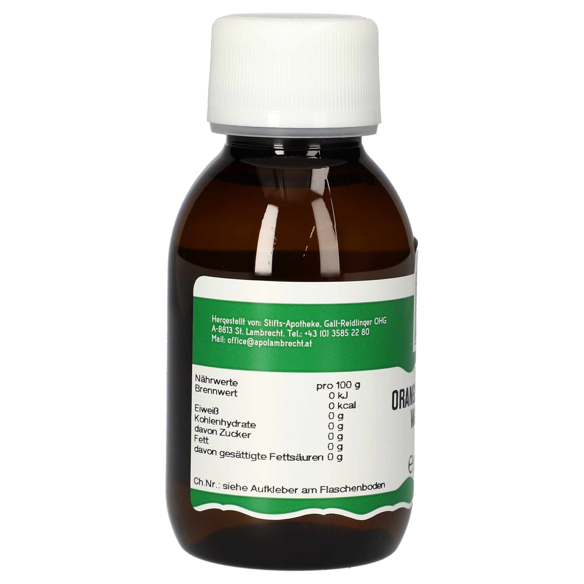 Wasser, Orangenblütenöl. Orangenblütenwasser enthält eine wässrige Lösung mit ätherischem Orangenblütenöl.