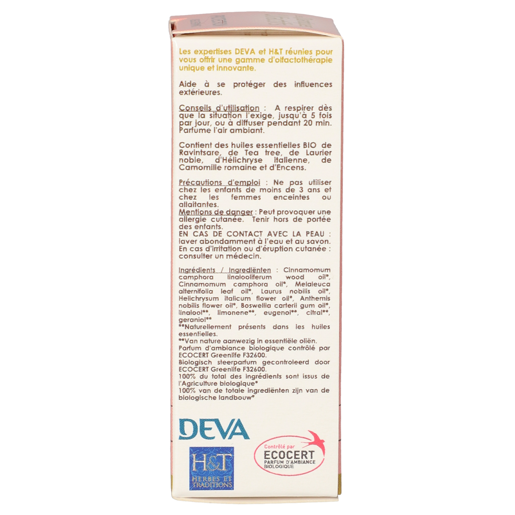 Biologischer Raumduft, enthält BIO ätherische Öle von Hô-Holz, Ravintsara, Teebaum, Lorbeer, Immortelle, römischer Kamille und Weihrauch. Inhaltsstoffe sind natürlichen Ursprungs aus biologischem Anbau, kontrolliert von Ecocert Greenlife F32600