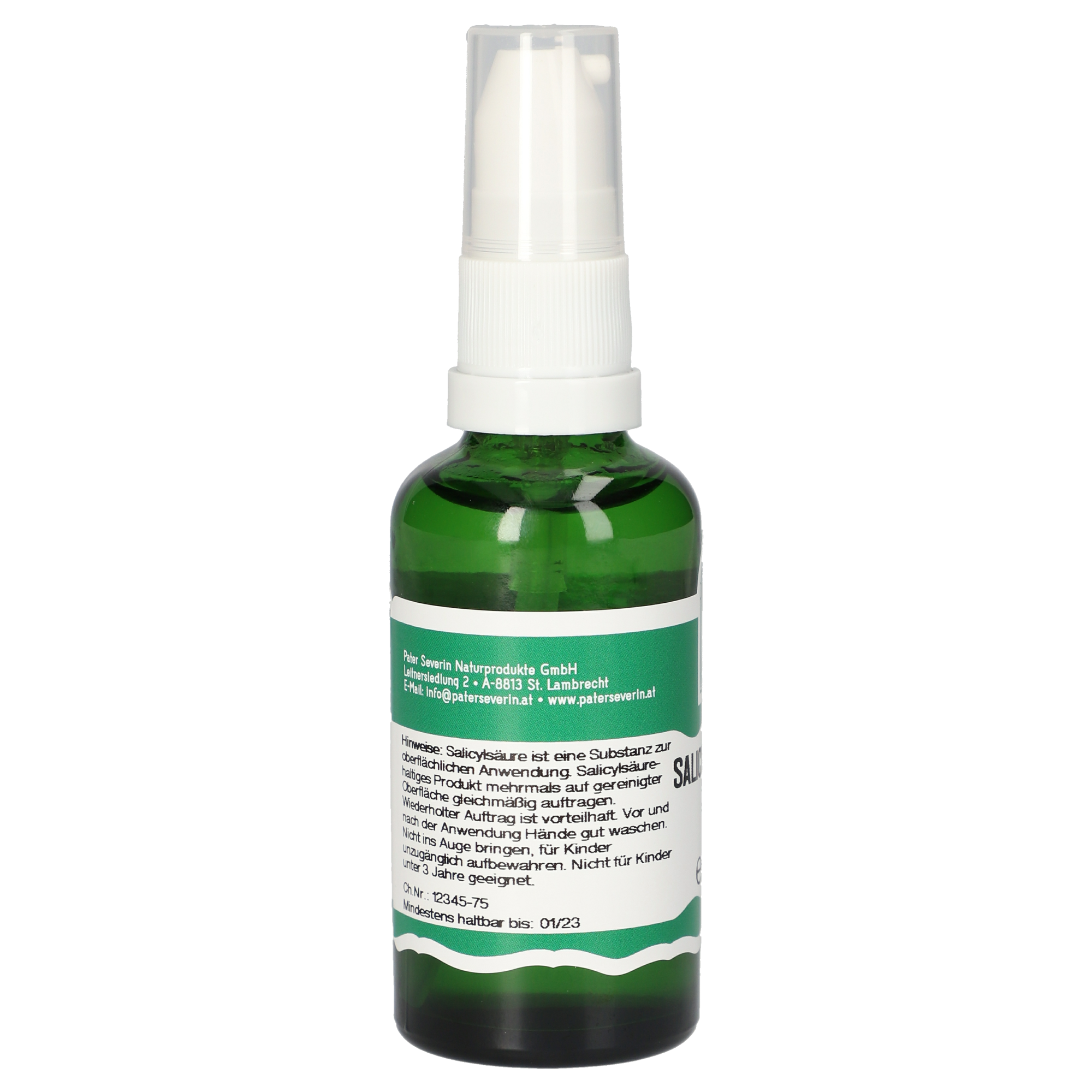 Die Salicylsäure wird bei diversen Hautproblemen eingesetzt. Salicylsäure ist eine organische Säure und ist für ihre keratolytischen und antiseptischen Eigenschaften bekannt. Ein großer Vorteil gegenüber Fruchtsäure ist, dass Salicylsäure tiefer in die Hautporen eindringen kann. Die obere Hautschicht (Hornschicht) wird aufgelockert und die abgestorbenen Hautschuppen werden abgelöst. Durch die beschleunigte Abschuppung wird die Haut zu einer schnelleren Erneuerung angeregt. Auch unreine Haut profitiert von den positiven Effekten der Salicylsäure. Zusammensetzung: Alcohol, Aqua, Salicylic acid. Hinweise: Kontakt mit den Augen vermeiden. Nicht auf Schleimhäute und offene Wunden auftragen. Für Kinder unzugänglich aufbewahren. Bei Raumtemperatur 60 Monate haltbar! Lokale Hautreizungen wie Brennen, Rötungen, trockene Haut oder Abschälen der Haut sowie allergische Reaktionen sind möglich. Verzehrempfehlung: Mehrmals täglich auftragen und eintrocknen lassen.