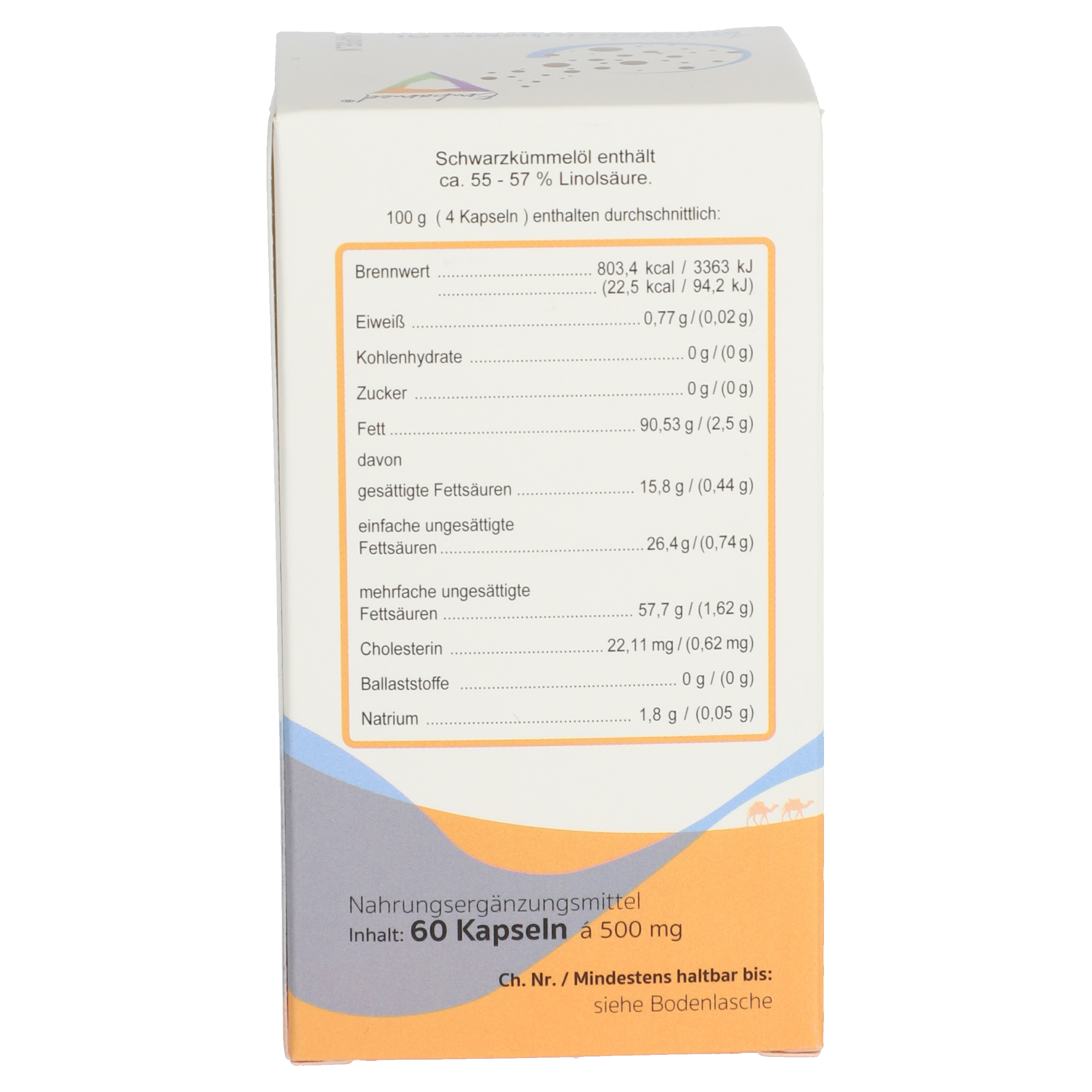 Ägyptisches Schwarzkümmelöl (71 %); Gelatine; Feuchthaltemittel: Glycerin; Farbstoff: Beta-Carotin.