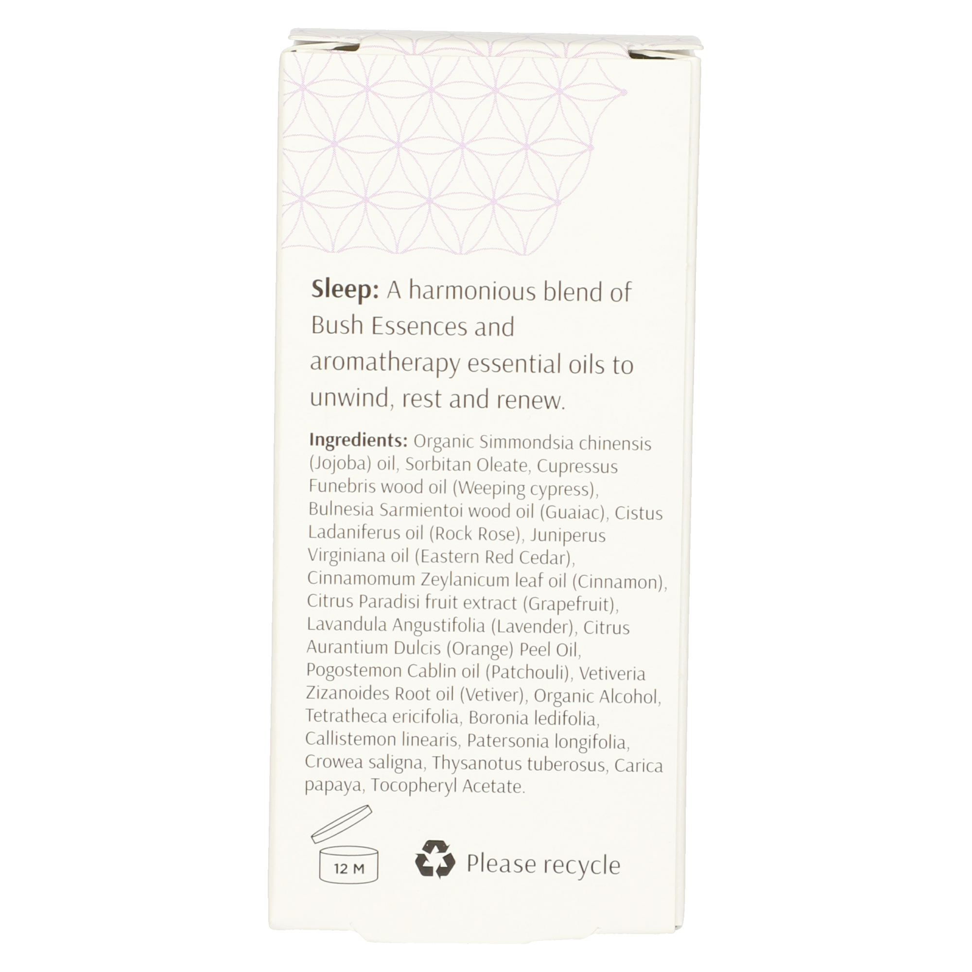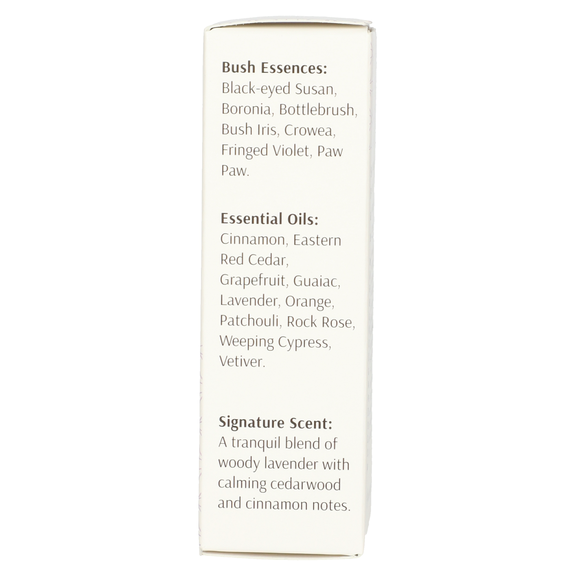 Biologisches Simmondsia chinensis (Jojoba) Öl, Sorbitan Oleate, Cupressus Funebris Holzöl (Trauerzypresse), Bulnesia Sarmientoi Holzöl (Guajak), Cistus Ladaniferus Öl (Zistrose), Juniperus Virginiana Öl (Östliche rote Zeder), Cinnamomum Zeylanicum Blattöl (Zimt), Citrus Paradisi Fruchtextrakt (Grapefruit), Lavandula Angustifolia (Lavendel), Citrus Aurantium Dulcis (Orange) Peel Oil, Pogostemon Cablin Oil (Patchouli), Vetiveria Zizanoides Root Oil (Vetiver), Bio-Alkohol, Tetratheca ericifolia, Boronia ledifolia, Callistemon linearis, Patersonia longifolia, Crowea saligna, Thysanotus tuberosus, Carica papaya, Tocopheryl Acetate.
