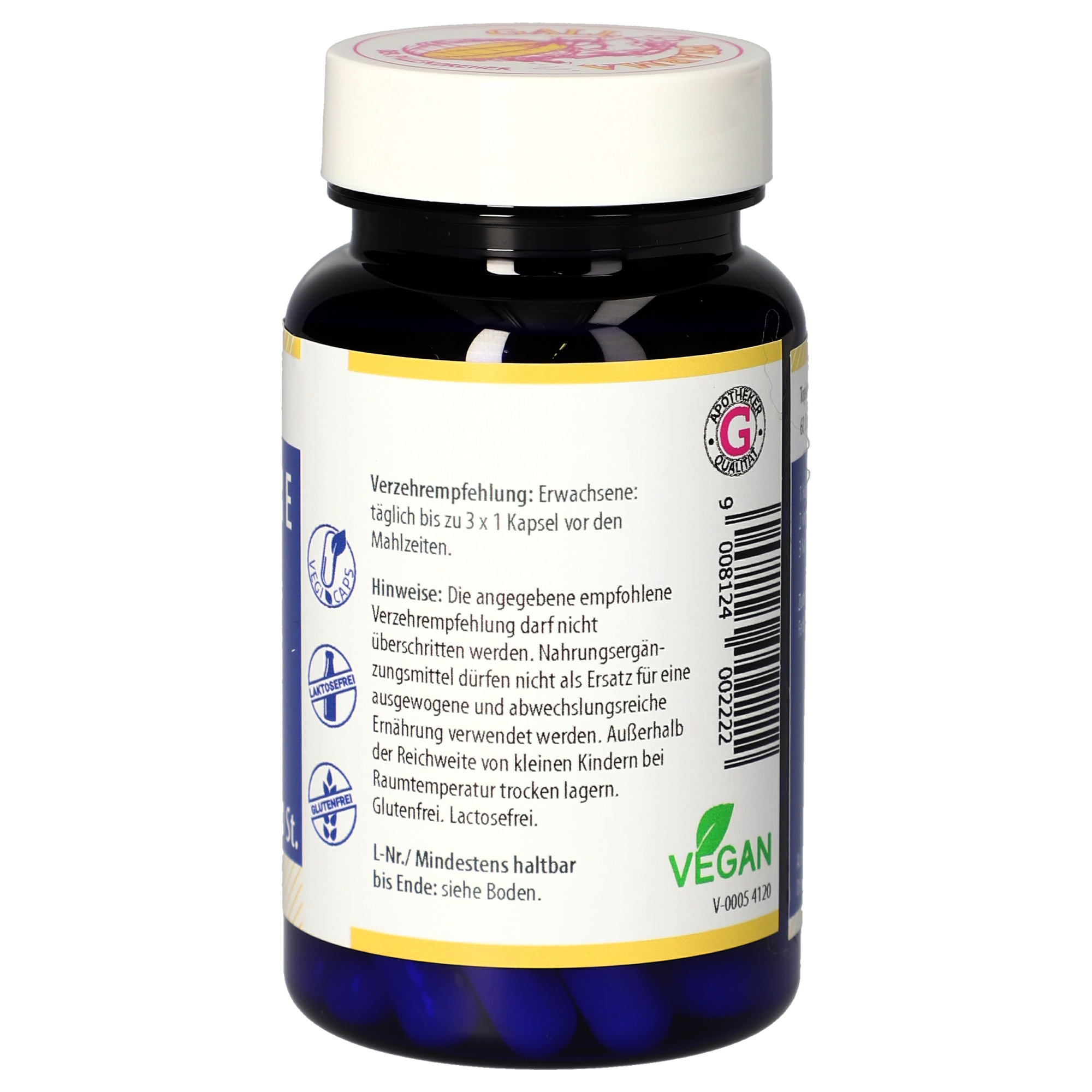 Zuerst kribbelt und juckt es im Bereich der Lippe, am nächsten Tag schwillt die Stelle an und wenige Stunden später bilden sich kleine Bläschen. Diese sind nicht nur unschön, sondern auch äußerst lästig und unangenehm. L-Lysin 500 mg Vegan GPH Kapseln enthalten Lysin in seiner natürlichen L-Form, das der Entstehung der unerwünschten Bläschen gegensteuert. Der Körper kann diese essenzielle Aminosäure nicht selbst herstellen und ist somit auf eine ausreichende Zufuhr durch die Nahrung angewiesen. Da vor allem tierische Lebensmittel L-Lysin enthalten, kann bei vegetarischer oder veganer Ernährung die Versorgung mit dieser Aminosäure unzureichend sein. Auch Stress steigert den Bedarf an dieser wichtigen Substanz. Doch L-Lysin sorgt nicht nur für schöne Lippen. Als proteinogene Aminosäure wird L-Lysin vor allem für den Aufbau von Proteinen benötigt. So findet es sich in zahlreichen Strukturen, wie etwa Elastin oder Kollagen, wieder. Darüber hinaus ist L-Lysin die Vorstufe von L-Carnitin, einem Schlüsselmetaboliten im Fettsäurestoffwechsel der Mitochondrien. L-Lysin fördert außerdem die Aufnahme von Calcium, einem Mineralstoff, der für den Erhalt normaler Knochen benötigt wird. Anwendungsgebiete: Für schöne Lippen Für Stoffwechsel und Bindegewebe Verzehrempfehlung: Erwachsene: 1 x 1 Kapsel täglich mit Flüssigkeit einnehmen. 1 Kapsel enthält 500 mg L-Lysinhydrochlorid. Zusammensetzung: L-Lysinhydrochlorid; Cellulose* *Kapselhülle Hinweise: Die angegebene empfohlene Verzehrempfehlung darf nicht überschritten werden. Nahrungsergänzungsmittel dürfen nicht als Ersatz für eine ausgewogene und abwechslungsreiche Ernährung verwendet werden. Außerhalb der Reichweite von kleinen Kindern bei Raumtemperatur trocken lagern. Glutenfrei. Lactosefrei. Hefefrei.