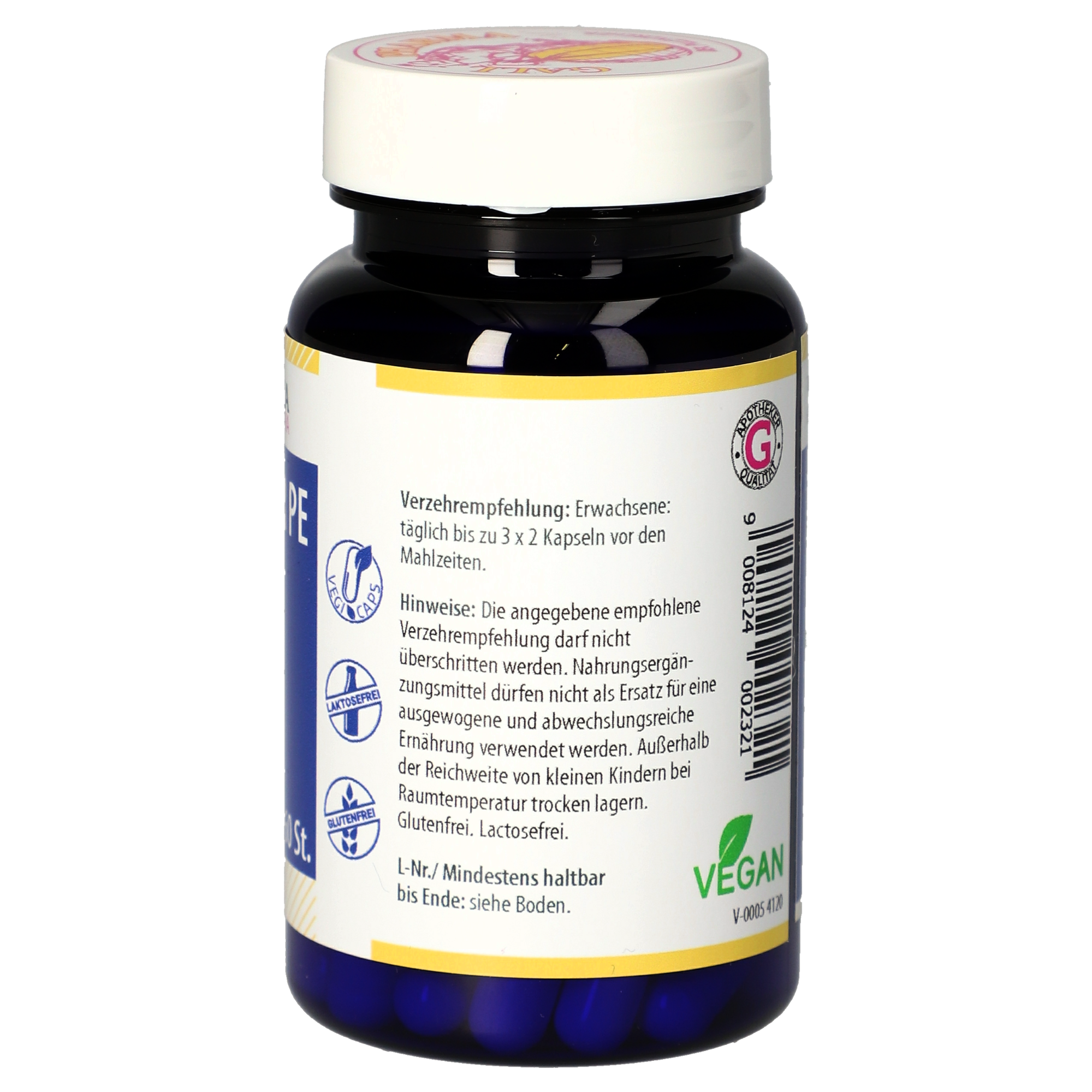 Die angegebene empfohlene Verzehrempfehlung darf nicht überschritten werden. Nahrungsergänzungsmittel dürfen nicht als Ersatz für eine ausgewogene und abwechslungsreiche Ernährung verwendet werden. Außerhalb der Reichweite von kleinen Kindern bei Raumtemperatur trocken lagern. Glutenfrei. Lactosefrei.