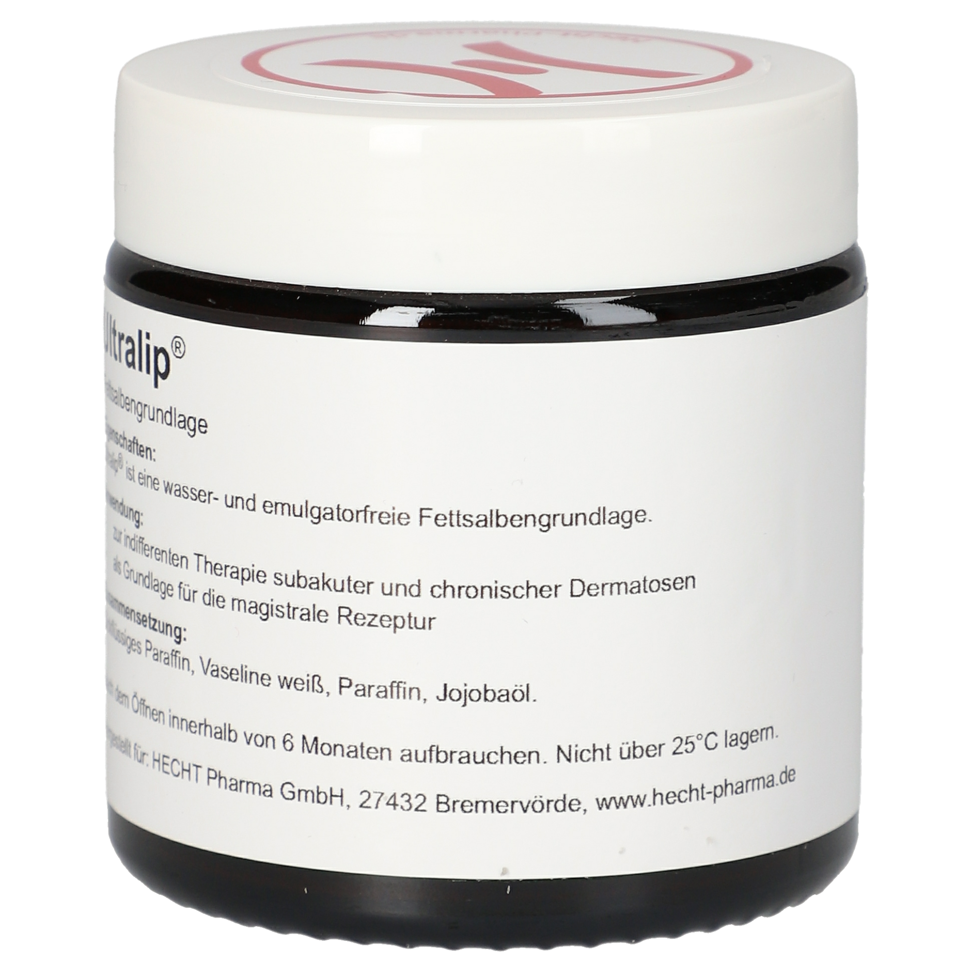 Ultralip® ist eine wasserfreie Fettsalbengrundlage, die ohne Konservierungsmittel auskommt. Diese hydrophobe Salbe ist emulgatorfrei und kann daher kein Wasser aufnehmen. Die regelmäßige Anwendung der Fettsalbe verleiht der Haut ein glattes, geschmeidiges Aussehen. Durch die Bildung einer Schutzschicht verhindert Ultralip® die Entstehung von rauer und spröder Haut. Die Herstellung erfolgt nach den GMP Richtlinien für pharmazeutische Produkte.
