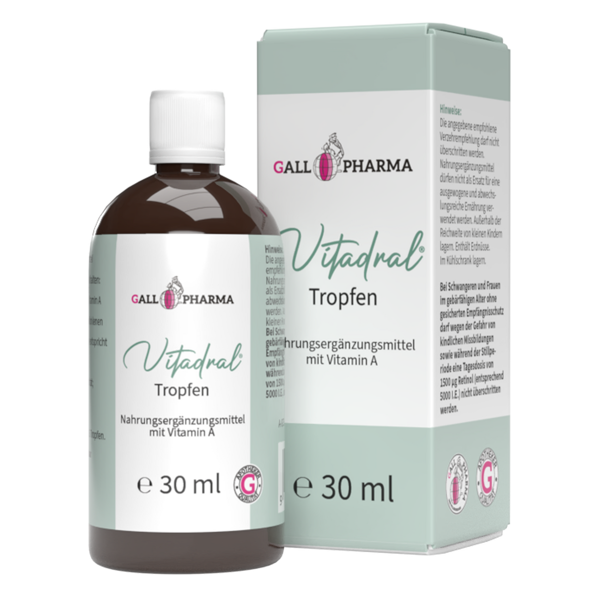Vitamin A kommt in der Natur häufig als langkettiger Fettsäureester vor. Die bekannteste Form ist Retinolpalmitat, das vor allem in tierischen Lebensmitteln enthalten ist. Dies ist die stabilste Form von Vitamin A und dient als Speichersubstanz. Vitamin A hat im Körper mehrere Funktionen. Und zwar trägt dieses Vitamin zur Erhaltung normaler Haut, Schleimhäute und einer normalen Sehkraft bei. Vitamin A spielt eine Rolle im Prozess der Zellspezialisierung. Zudem unterstützt es die normale Funktion des Immunsystems und trägt zu einem normalen Eisenstoffwechsel bei. Da Vitamin A fettlöslich ist, kann eine geringe Fettzufuhr die Verwertung im Körper verringern. In Vitadral® Tropfen liegt Retinolpalmitat deshalb in Erdnussöl gelöst vor.